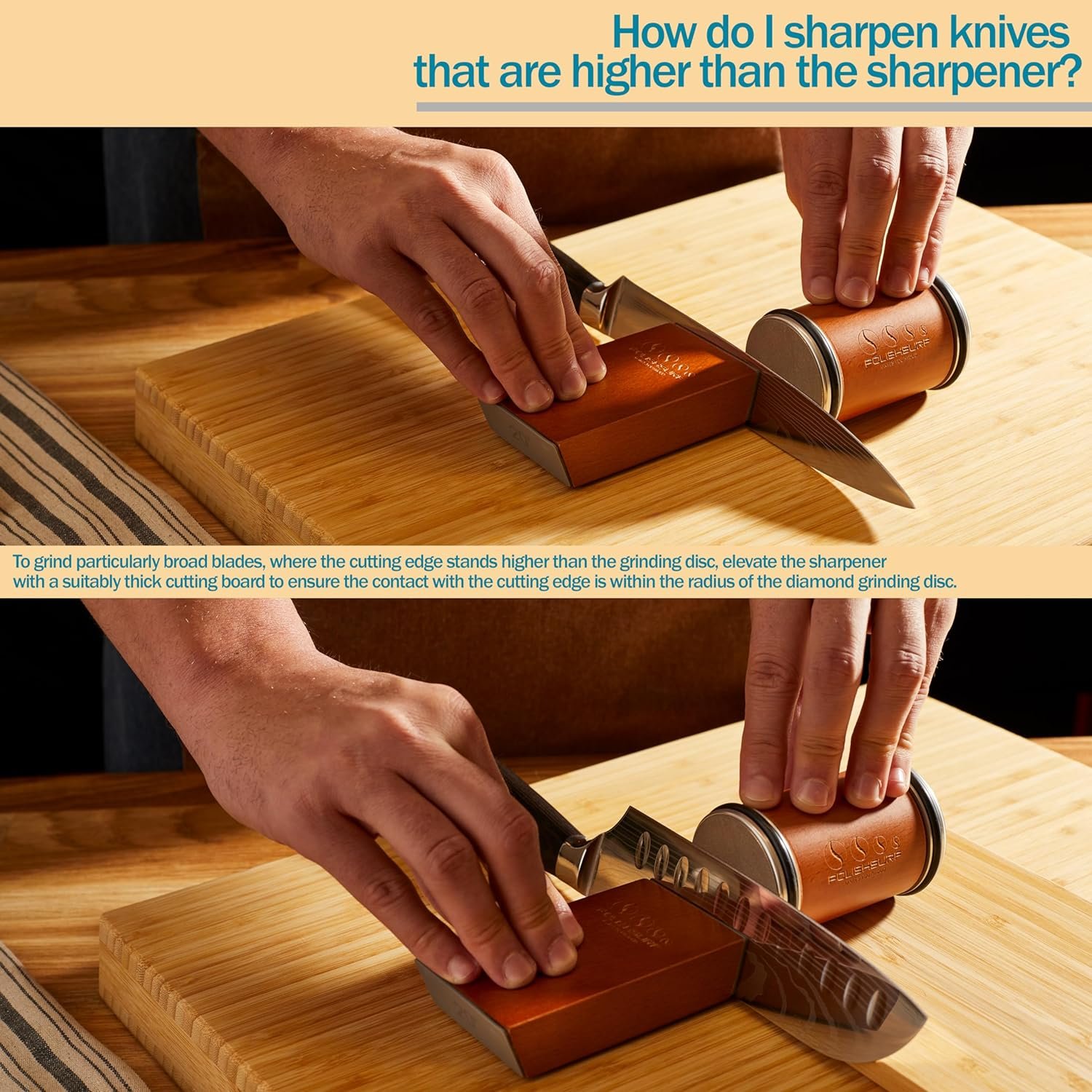 Professional Rolling Knife Sharpener: An uncompromising precision for your favourite knives is brought by determining the correct grinding angle. Start by sharpening your knife on the 15° side for three to five minutes. If the sharpness is not satisfactory, it is advisable to use the 20° grinding angle.