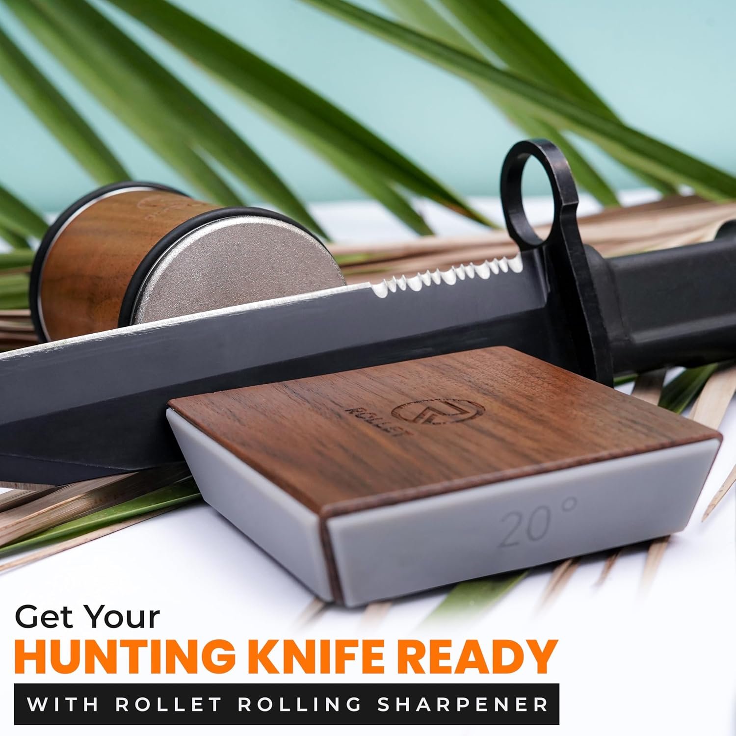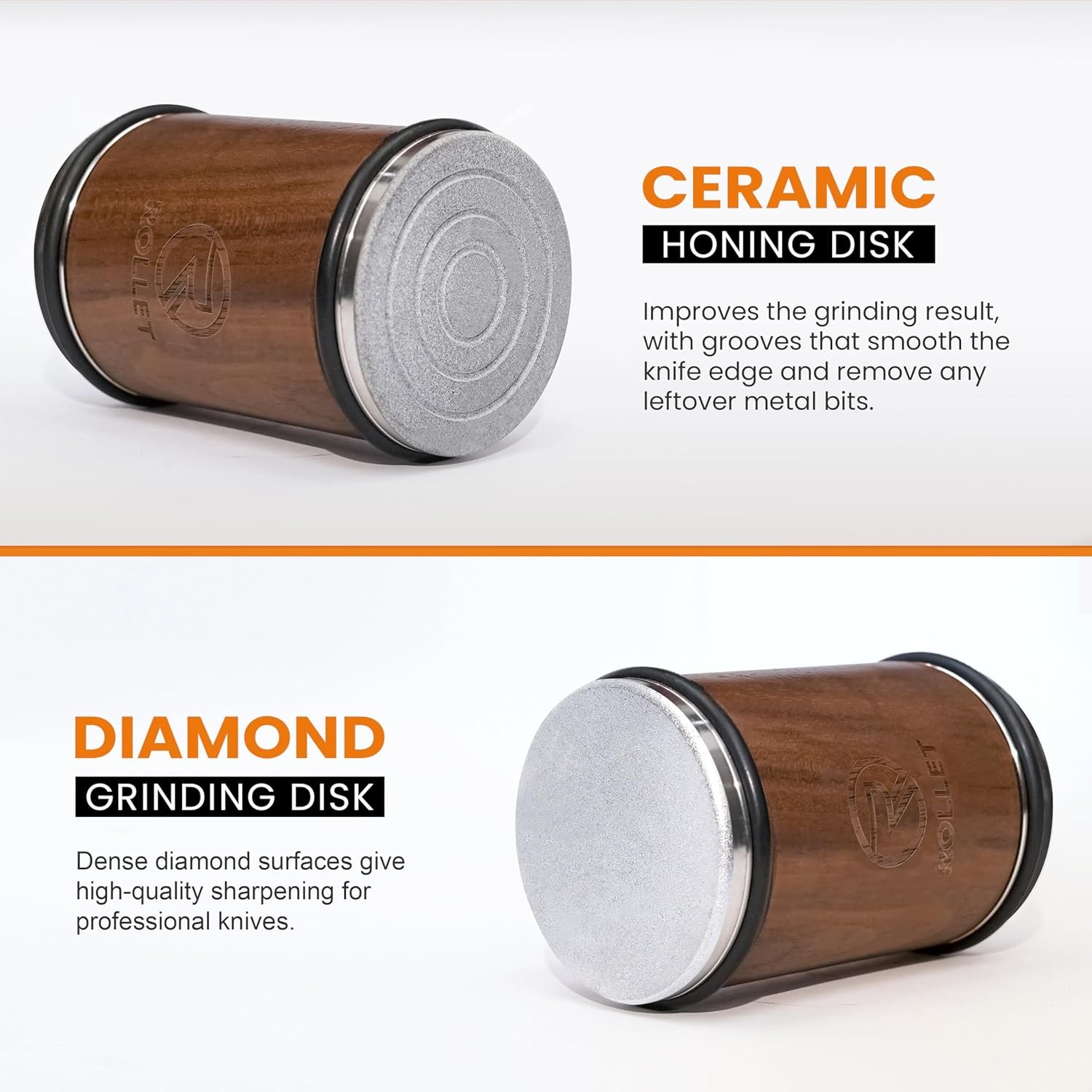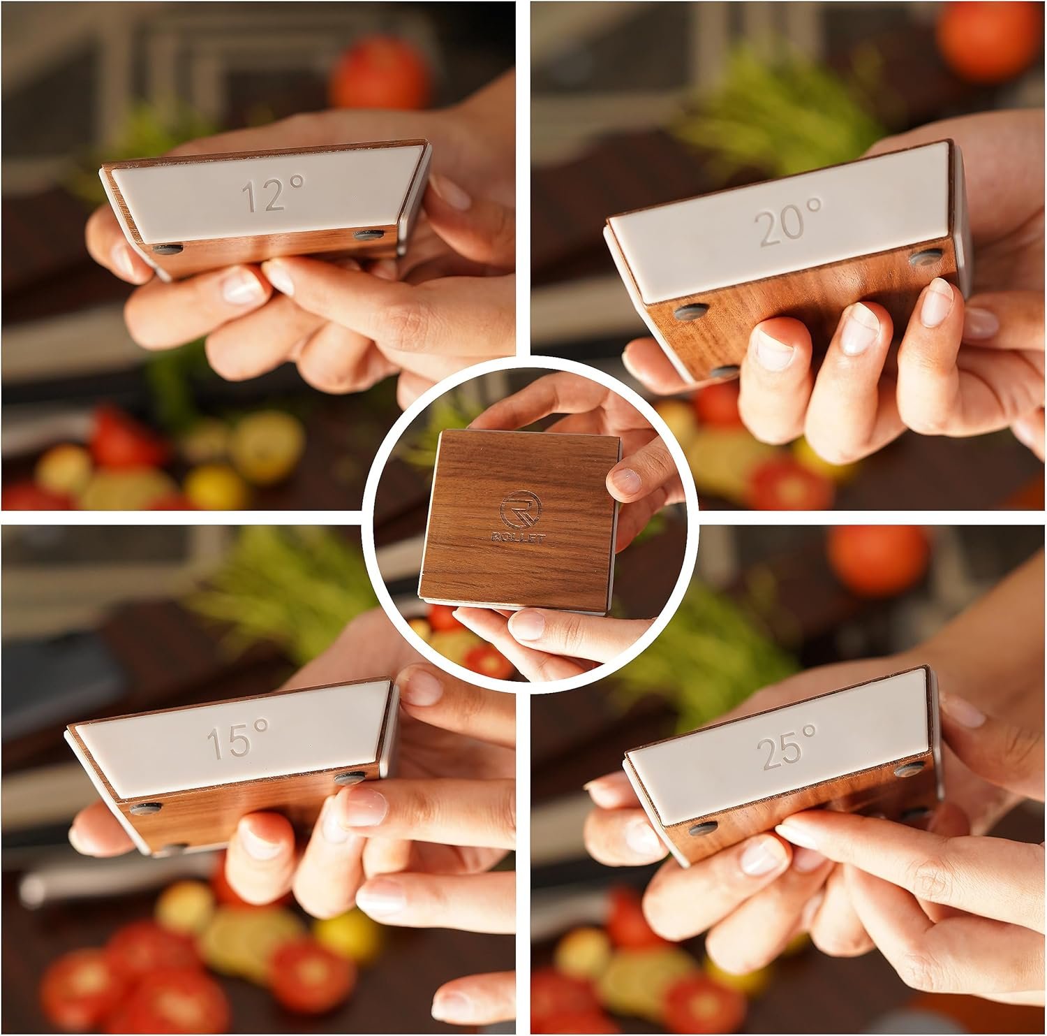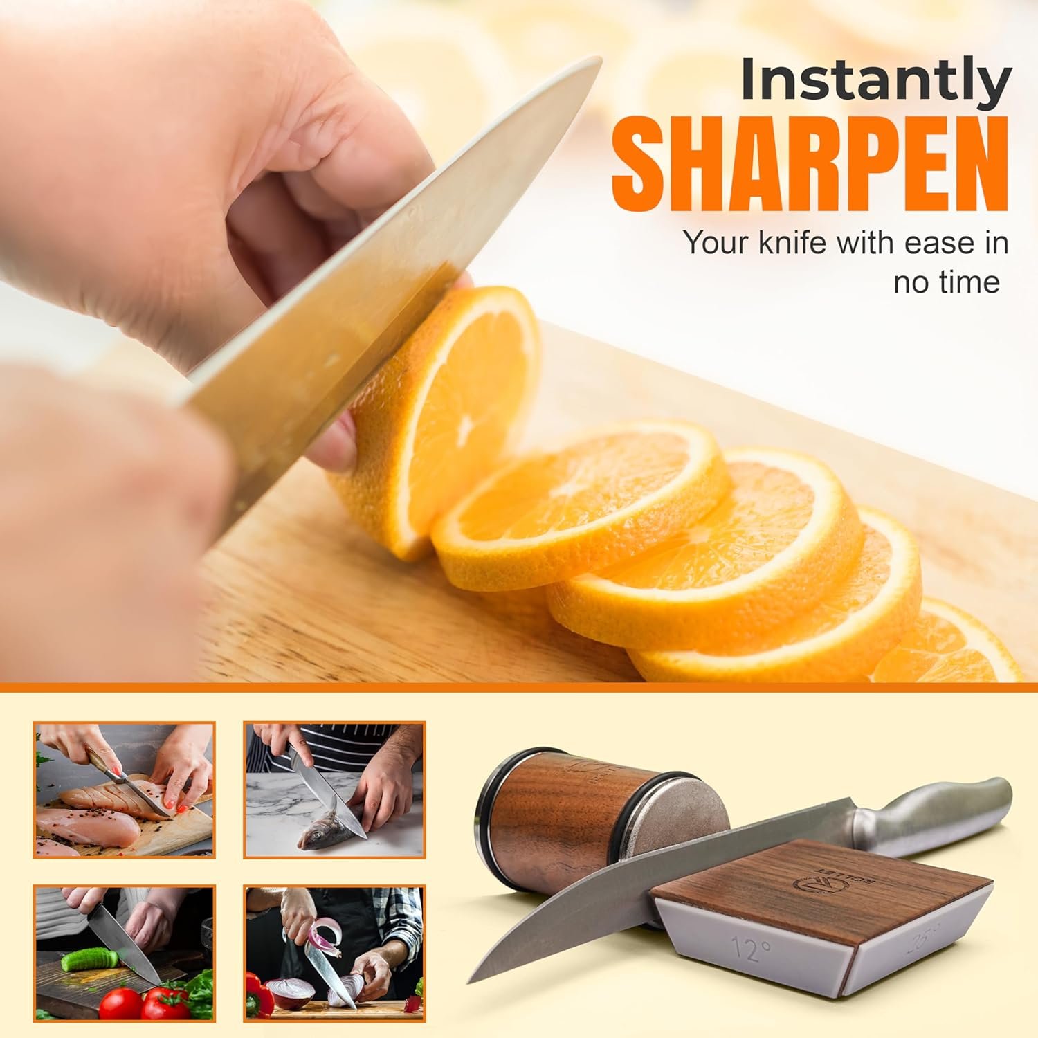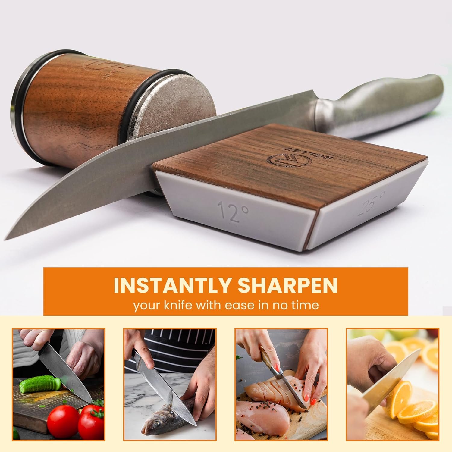 Premium Materials: Our Rolling Knife Sharpener, crafted from 100% High-grade walnut wood which gives a unique feel and grip, features high-quality diamond and ceramic sharpening disks. These industrial-grade diamonds provide unparalleled durability and efficiency, capable of sharpening knives of any hardness.