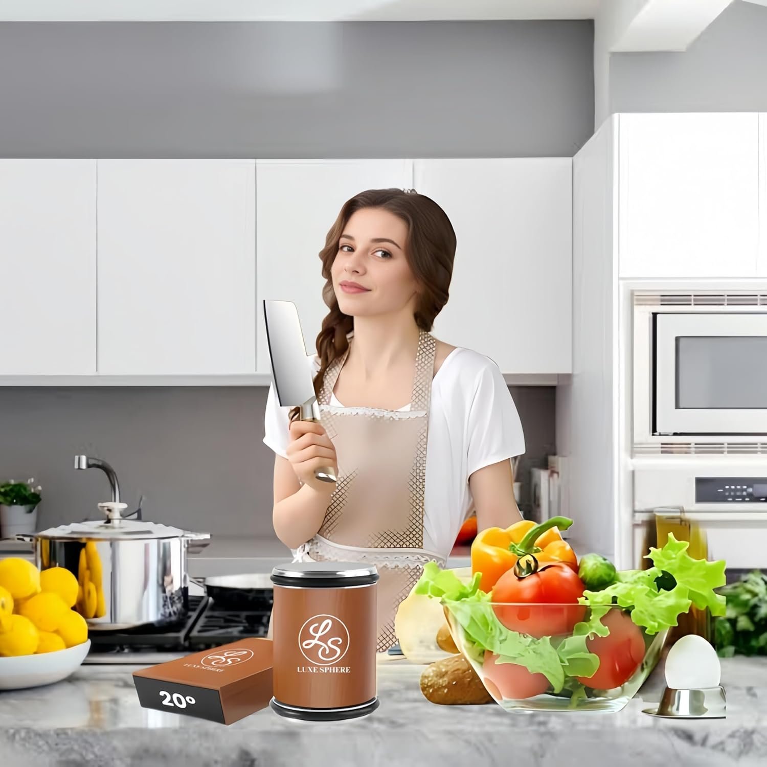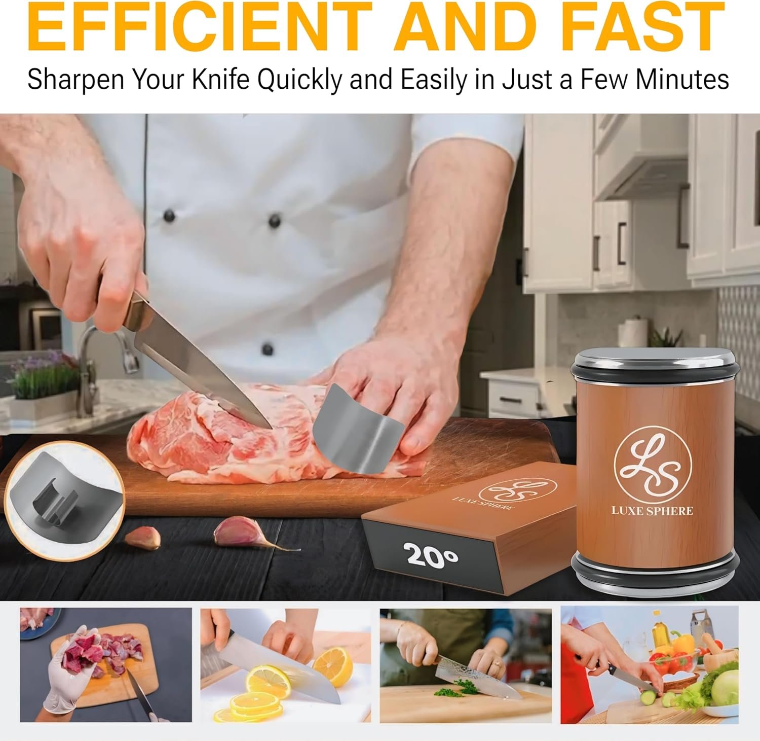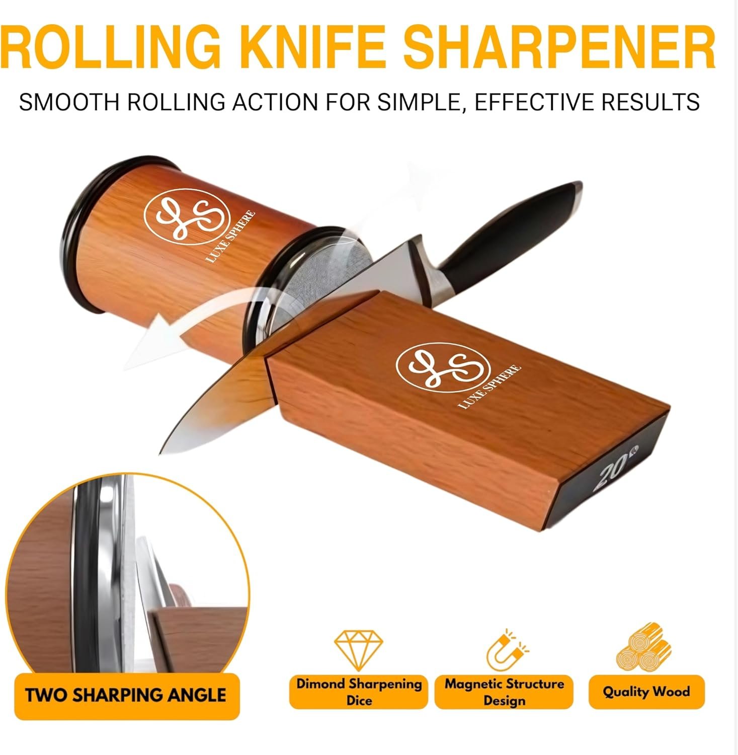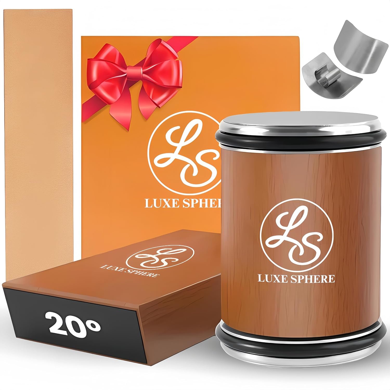 Introducing the LUXE SPHERE Knife Sharpener Tool – your ultimate solution for maintaining razor-sharp edges on all your knives. Crafted with precision and ease of use in mind, this professional-grade sharpener ensures your blades stay at their best, ready to tackle any culinary challenge.Features:1: Professional Precision: With diamond and ceramic discs, our sharpener removes imperfections, ensuring long-lasting sharpness.2: Stability and Precision: Crafted from natural beech wood with 6 strong magnets, it offers stability and triple magnetic attraction during knife sharpening3: Customizable Angles: Choose between 15 and 20 angles for delicate to robust blades.4: Effortless Operation: Fix your knife onto the magnetic holder and gently roll the sharpener stone for hassle-free sharpening.5: Gift-Ready Packaging: Packaged in a premium gift box, it’s perfect for any occasion, ideal for knife collectors, families, and friends.How to Use:Select the desired angle (15 or 20) by adjusting the magnetic holder.Securely place your knife onto the holder.Gently roll the sharpener stone across the blade, applying even pressure.Repeat until desired sharpness is achieved.Wipe the blade clean and enjoy the precision of a razor-sharp edge.Elevate your sharpening game with the LUXE SPHERE Knife Sharpener Tool – keeping your blades sharp, precise, and ready for action.