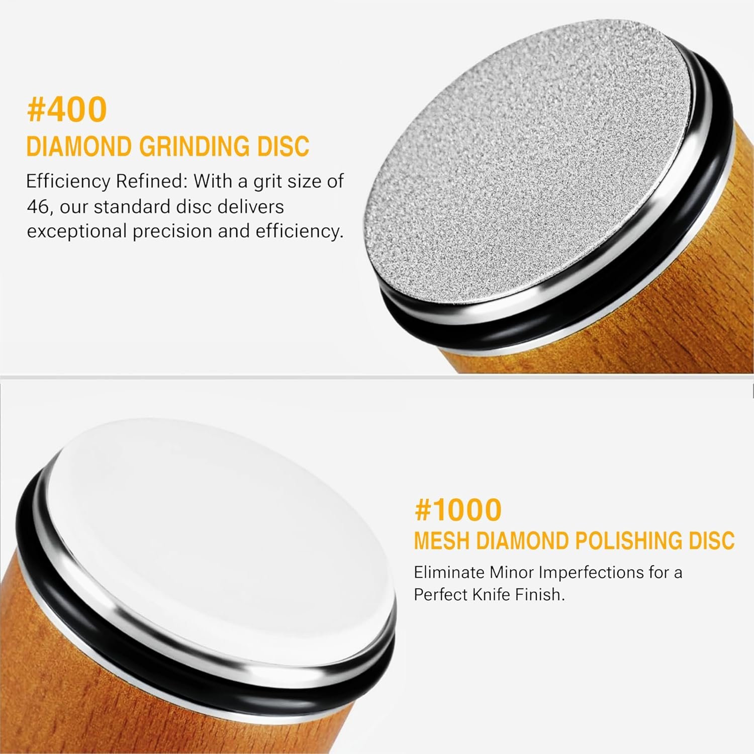 {Superior Diamond Sharpening} Our advanced sharpening system utilizes industrial diamonds for exceptional results. The 400 Mesh kitchen knife sharpening diamond disc efficiently hones your knife to the desired sharpness, while the 1000 Mesh fine diamond disc removes minor imperfections and smooth the surface. Get a smooth edge with fine diamonds and make your knives razor-sharp using a leather strop. Keep your blades in great shape quickly and easily