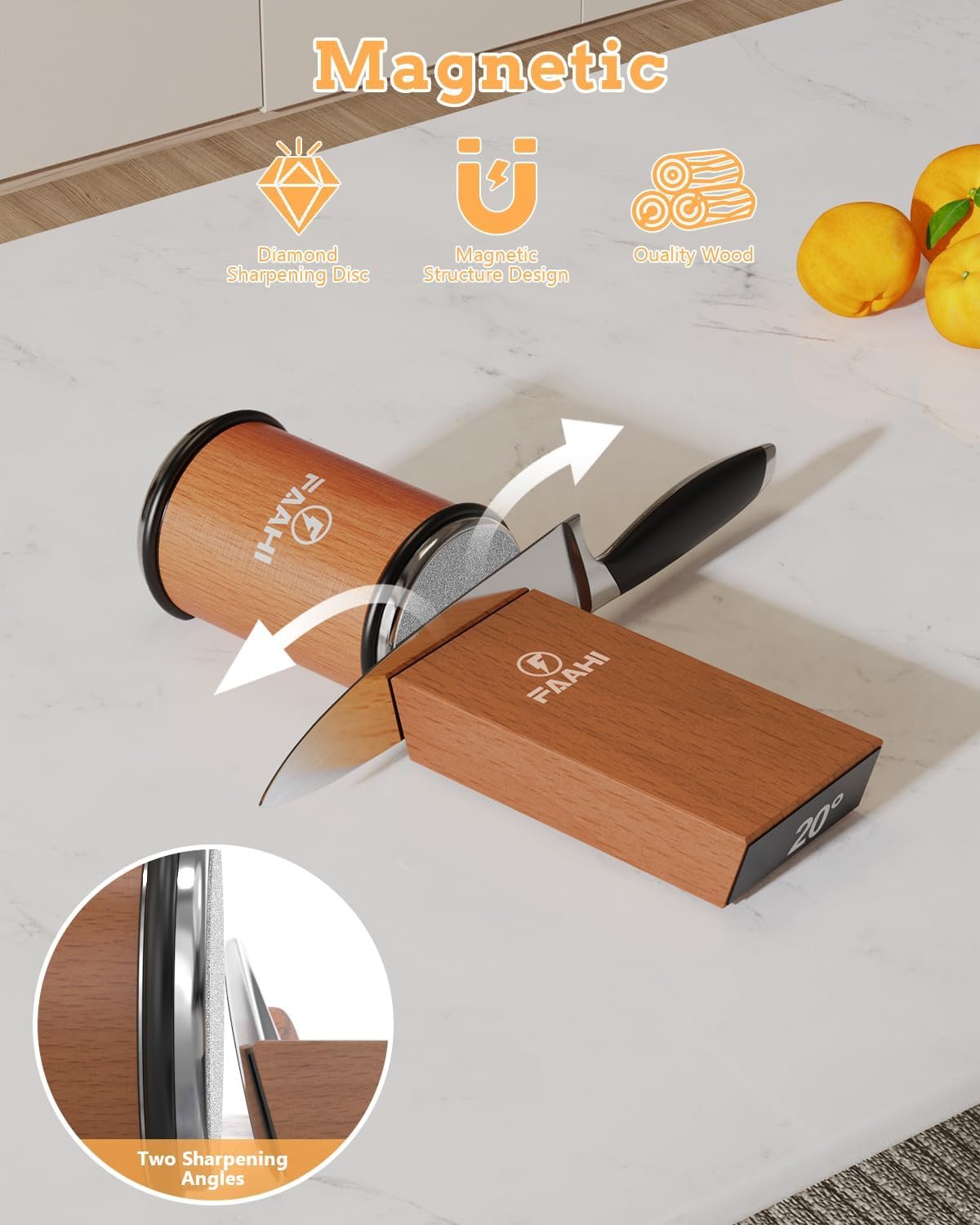 [Wide Range of Application]: Faahi rolling knife sharpener is made of high-quality natural wood and professional precision diamond grinding head, suitable for many types of kitchen knives, such as western knives, chef’s knives and Chinese kitchen knives(Scissors and serrated knives are excluded), is an essential tool for professional chefs and home cooking.