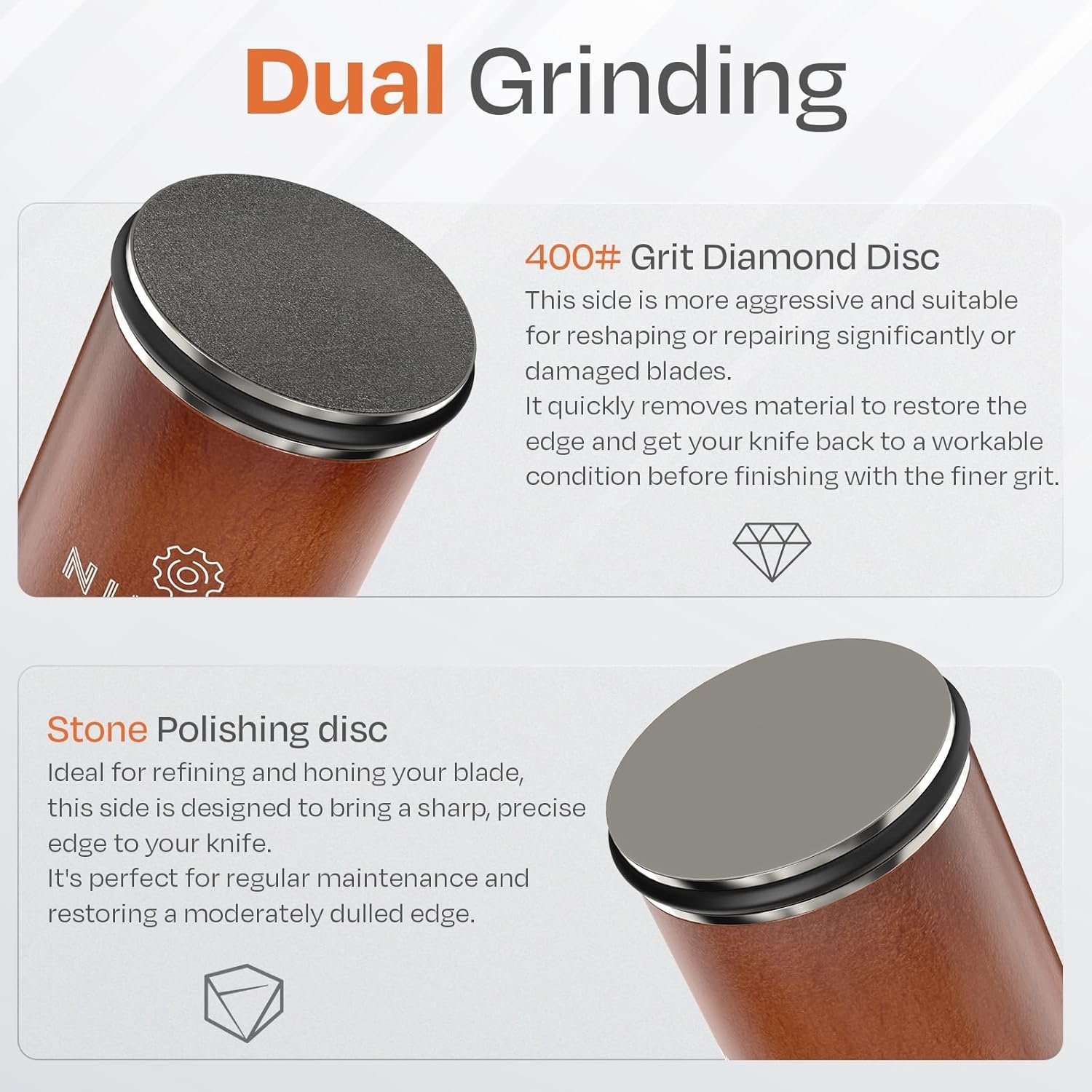 【Dual-Function Design】This rolling knife sharpener features a 400# grit diamond disc for effective and rapid sharpening, paired with a honing disc on the opposite side for precision finishing. This dual-function design ensures your kitchen knives maintain a razor-sharp edge, allowing for optimal performance with every cut.