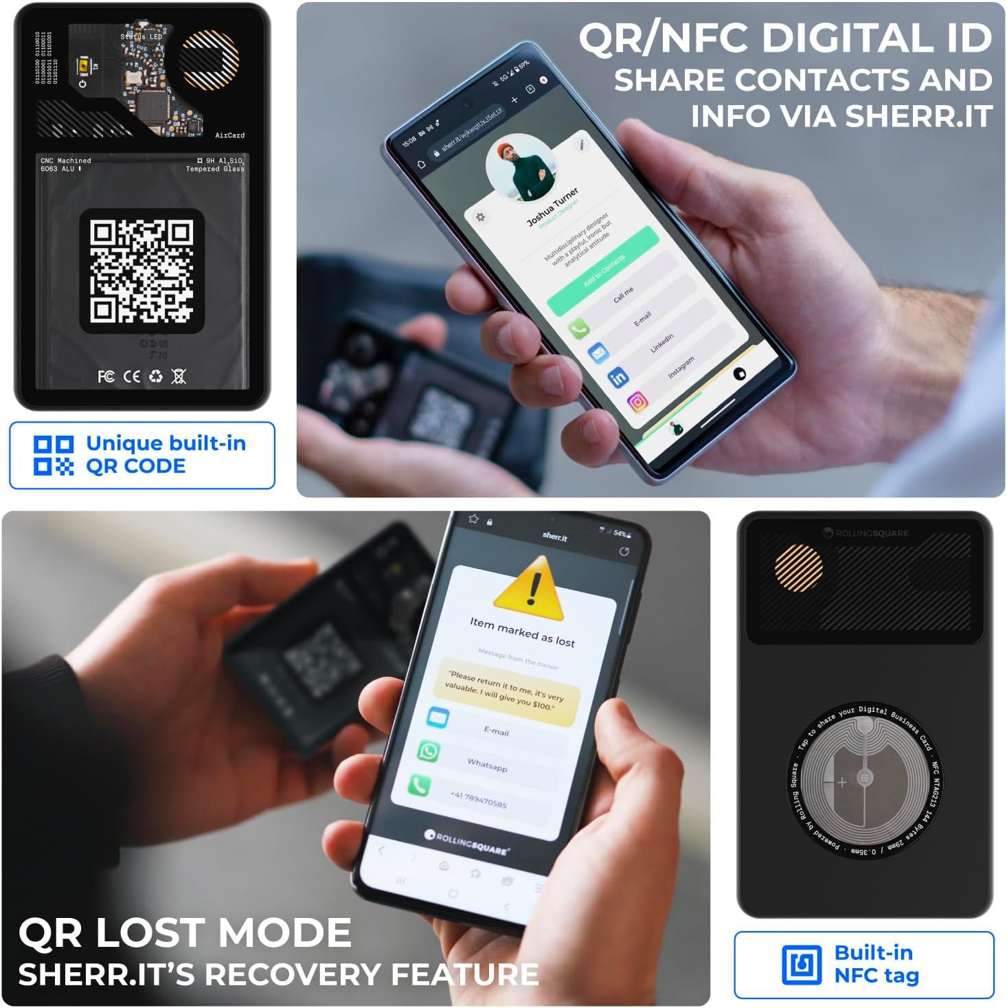 Digital Business Card: Featuring a visible QR code and a NFC tag connected to a custom Sherr.it profile, the AirCard allows you to create and share your own digital identity with links to your top contacts and social media accounts