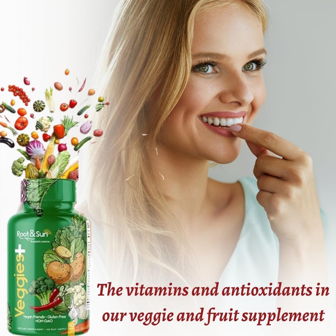 Elevate your daily wellness with Root & Sun Fruits and Veggies Plus Superfood Supplement. Our premium blend of all-natural, freeze-dried fruits and vegetables is meticulously crafted to retain essential vitamins, minerals, and antioxidants. The easy-to-swallow capsules ensure a convenient way to fortify your body with the nutrients it craves. Experience enhanced supplement absorption with the addition of BioPerine, making this super digestible formula gentle on your digestive system. Supporting a well-balanced diet, our supplement provides a daily vitamin boost to promote overall health and wellness. Feel reenergized from the inside out as our non-GMO, vegan, and keto-friendly capsules nourish your body, aiding in maintaining energy levels, building strength, and staying active with vigor. Suitable for both kids and adults, Root & Sun supplements are gluten-free and safe for all. Prioritize your health effortlessly with our 30-day supply of 90 capsules per bottle. Invest in your well-being with this high-quality superfood supplement that guarantees you’re giving your body the essential fruits and vegetables it deserves. Root & Sun is your key to a healthier, more vibrant lifestyle.