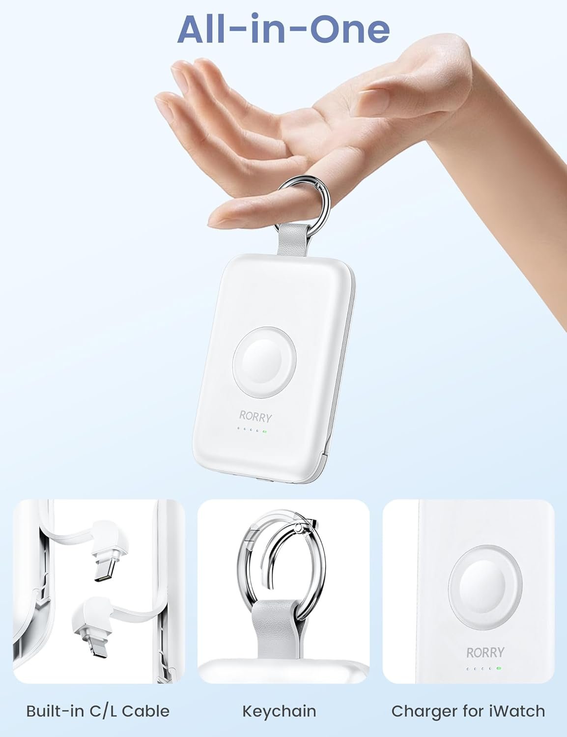 Meets all Your Charging Needs: RORRY portable charger with built in USB-C cable, iOS cable and magnetic wireless charger for iWatch , widely compatible with iPhone 16/15/14/13/12/11/XS/XR/SE Pro/Pro Max, Apple Watch Ultra 2/Ultra/9/8/7/6/SE/5/4/3/2, AirPods and more.