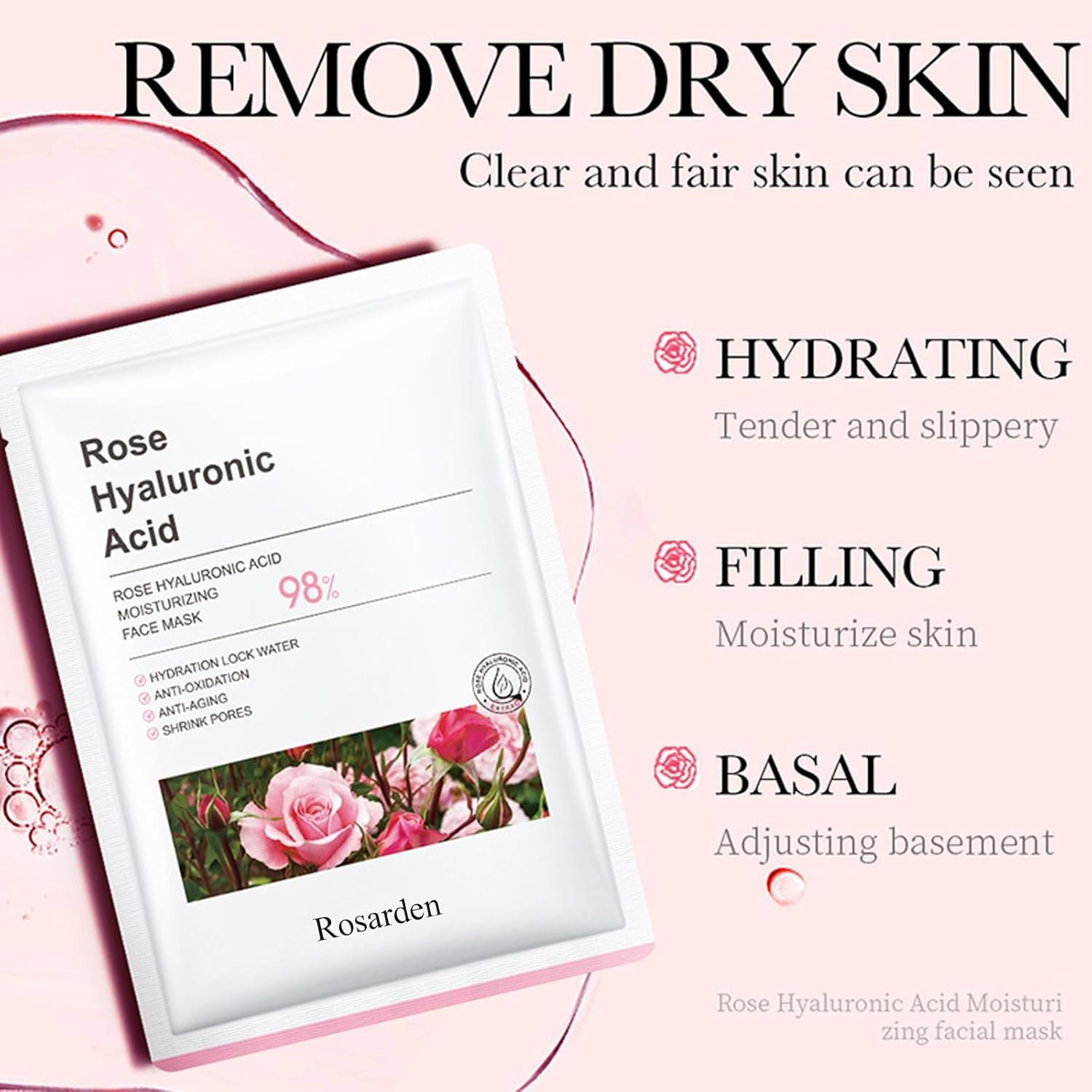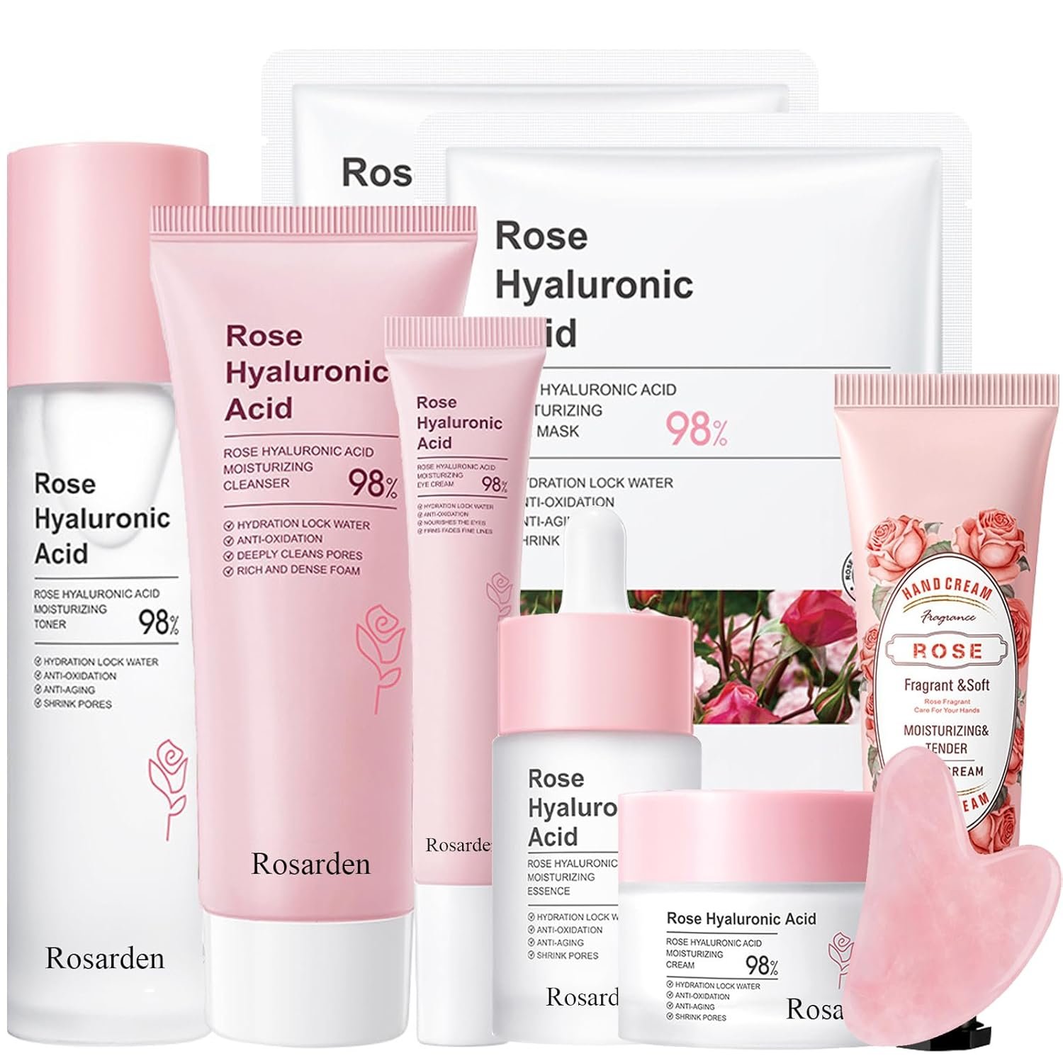 [Rose Skin Care Set]: Our face care set includes 1*rose toner, 1*rose serum, 1*face cream, 1* rose cleanser, 1* rose eye cream, 1* hand cream, 2* facial masks, 1* scraping board, 9pcs womens skin care set containing rose serum and hyaluronic acid, facial skin care set can replenish dry skin with water, reduce fine lines and restore skin elasticity