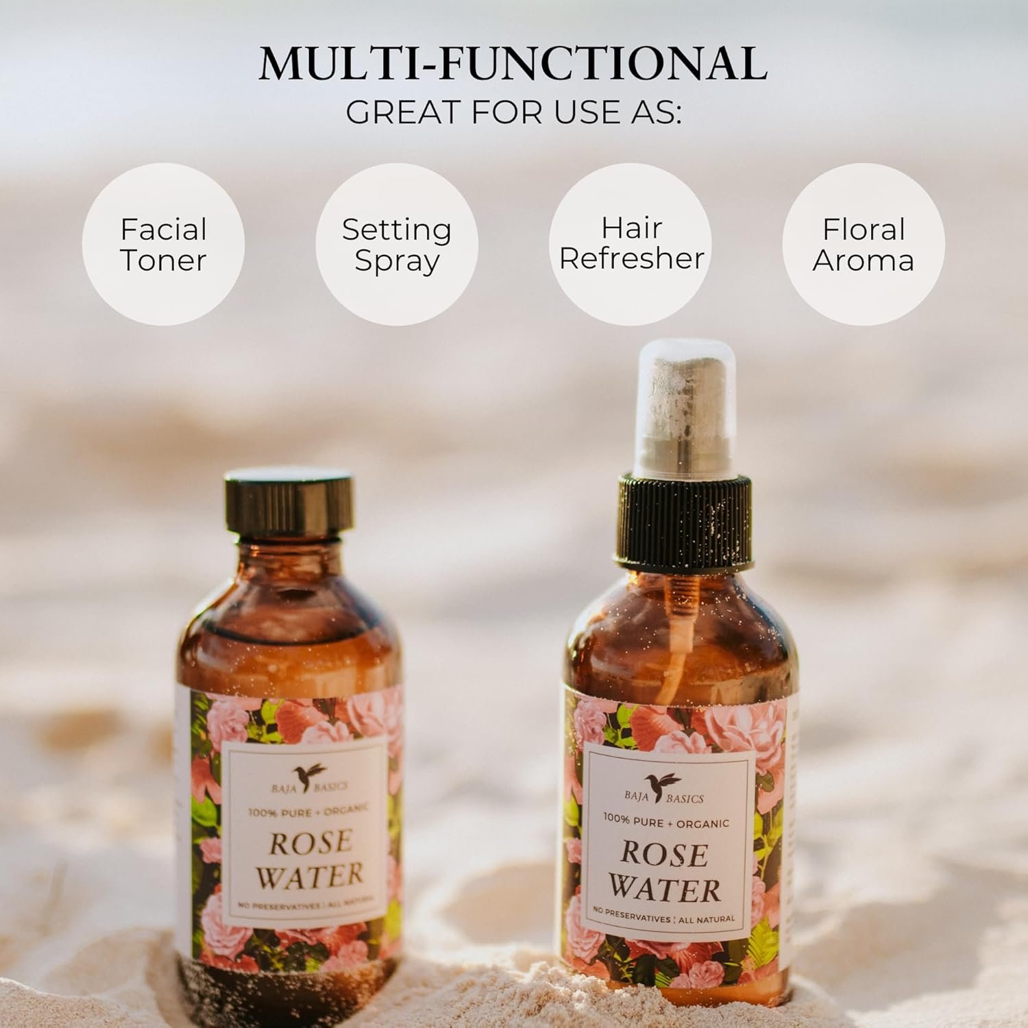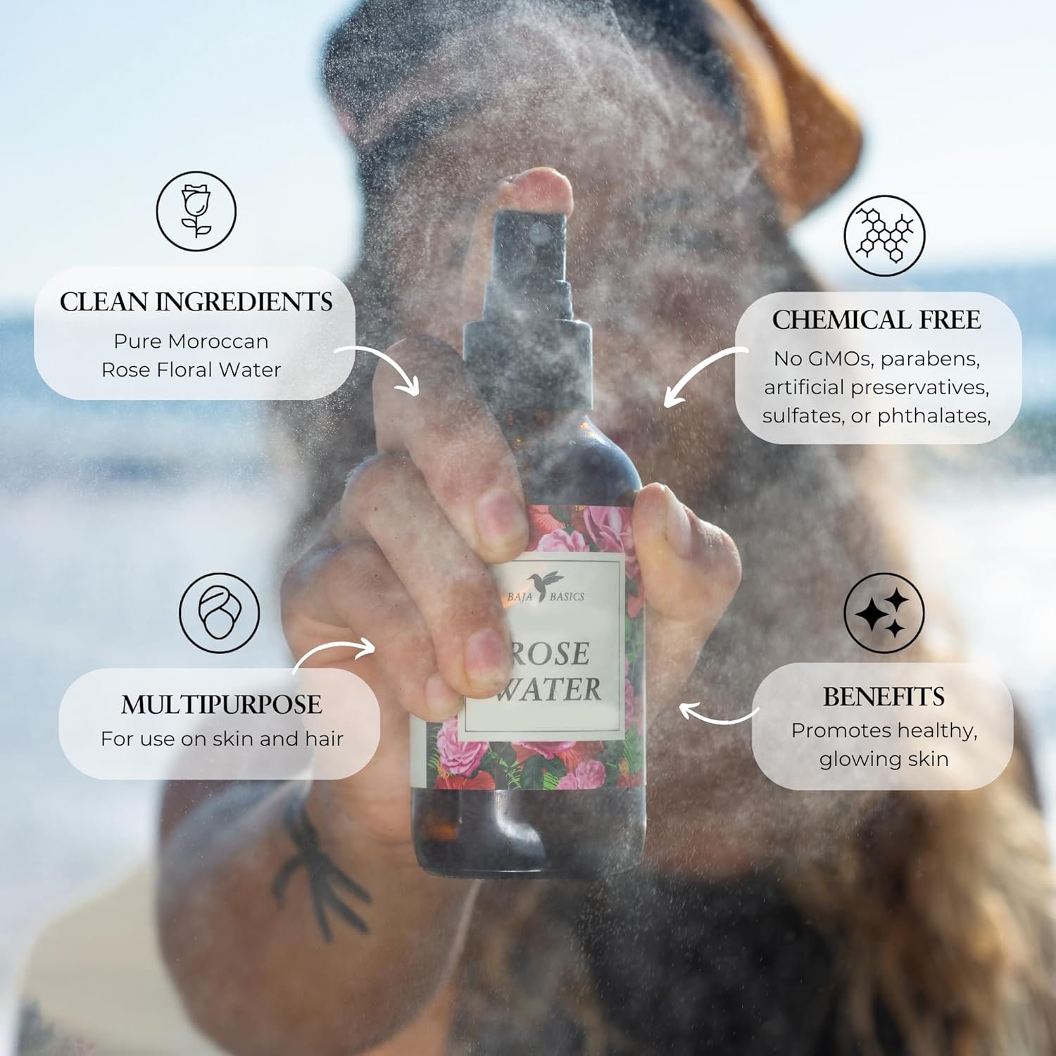 Baja Basics Rose Water is a facial mist that contains only one INGREDIENT: Moroccan rose floral water (rosa damascena). There are no GMOs, no parabens, no sulfates, no perfumes and no chemicals. This product is vegan and cruelty free. Good vibes only!