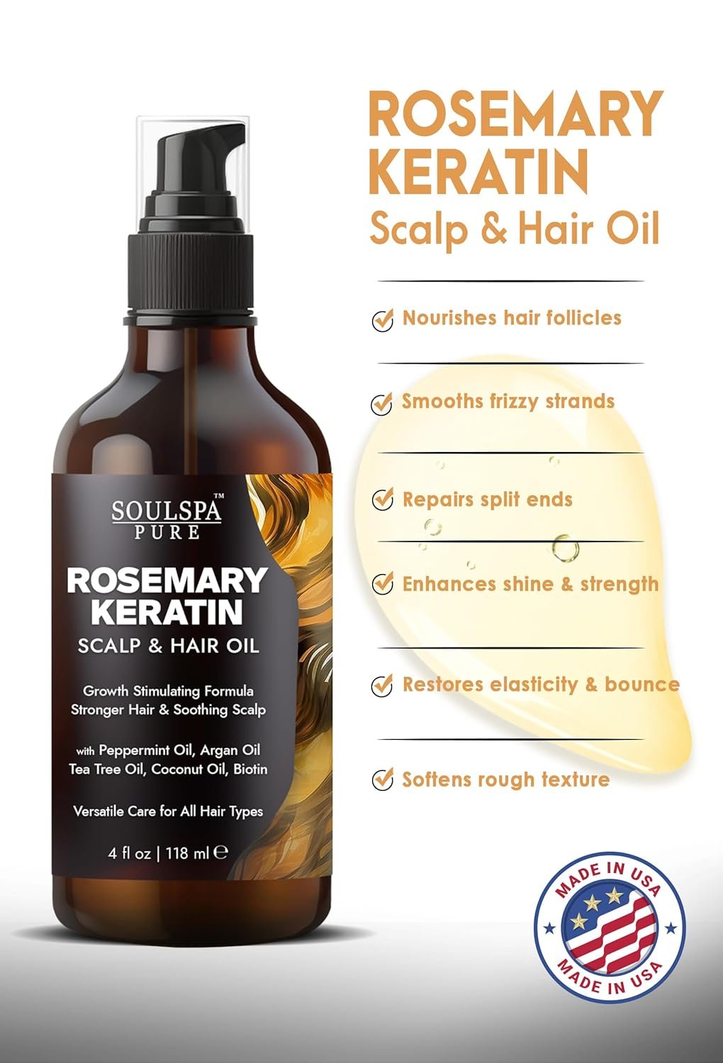 Rosemary Hair Oil – Keratin Infused, Strengthens, Revitalizes & Promotes Hair Growth, Rosemary Scalp Oil – with Biotin, Peppermint Oil & Tea Tree Oil for Optimal Hair Care – 4 fl oz