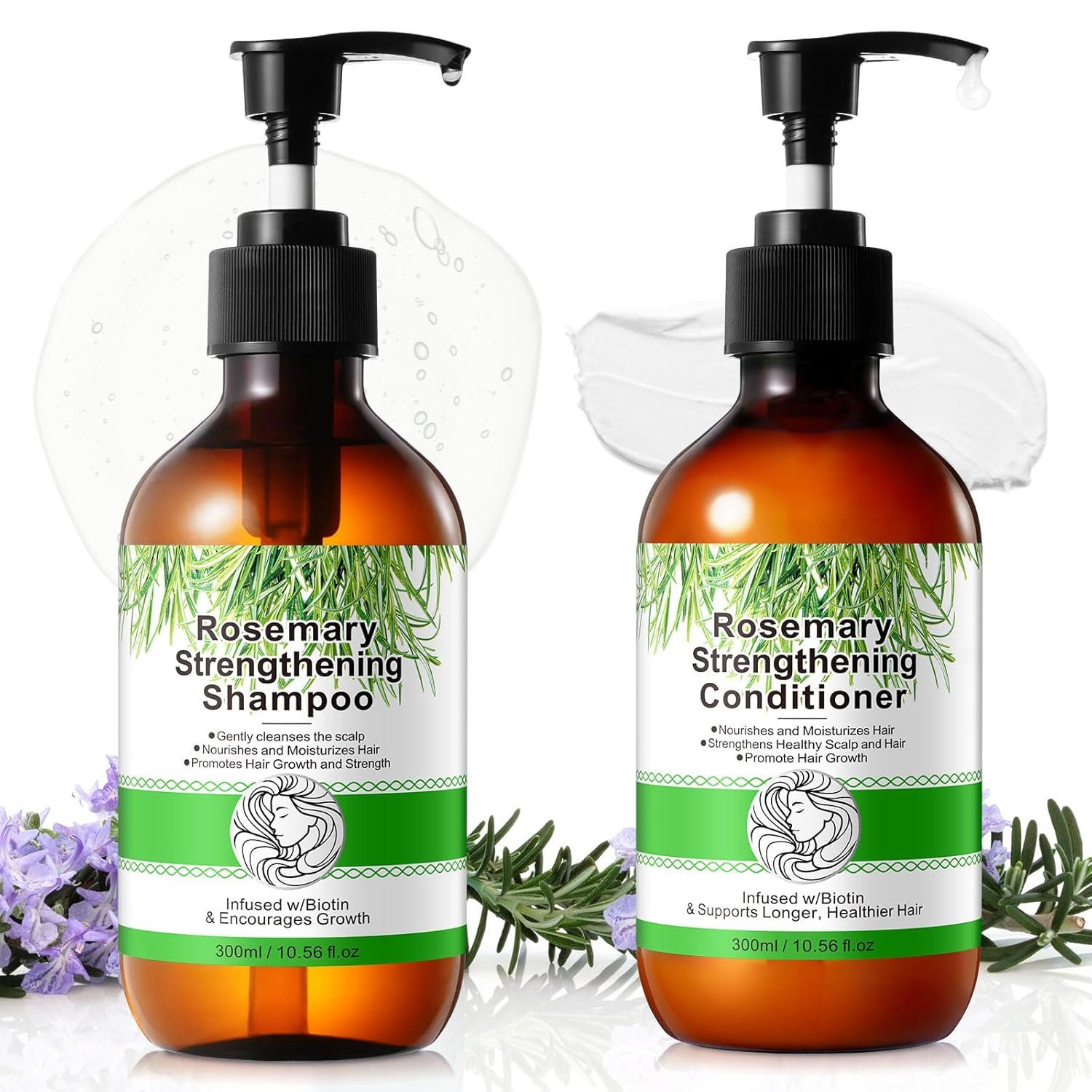 🌸【2 in 1 Shampoo and Conditioner Set】Rosemary Mint Strengthening 10.56fl.oz/300ml Shampoo & 10.56fl.oz/300ml conditioner. PROVIDE DEEP NOURISHMENT: Nourishing your scalp,revitalizing and detangling dry,damaged hair,enhnacing hair’s shine and smoothness.
