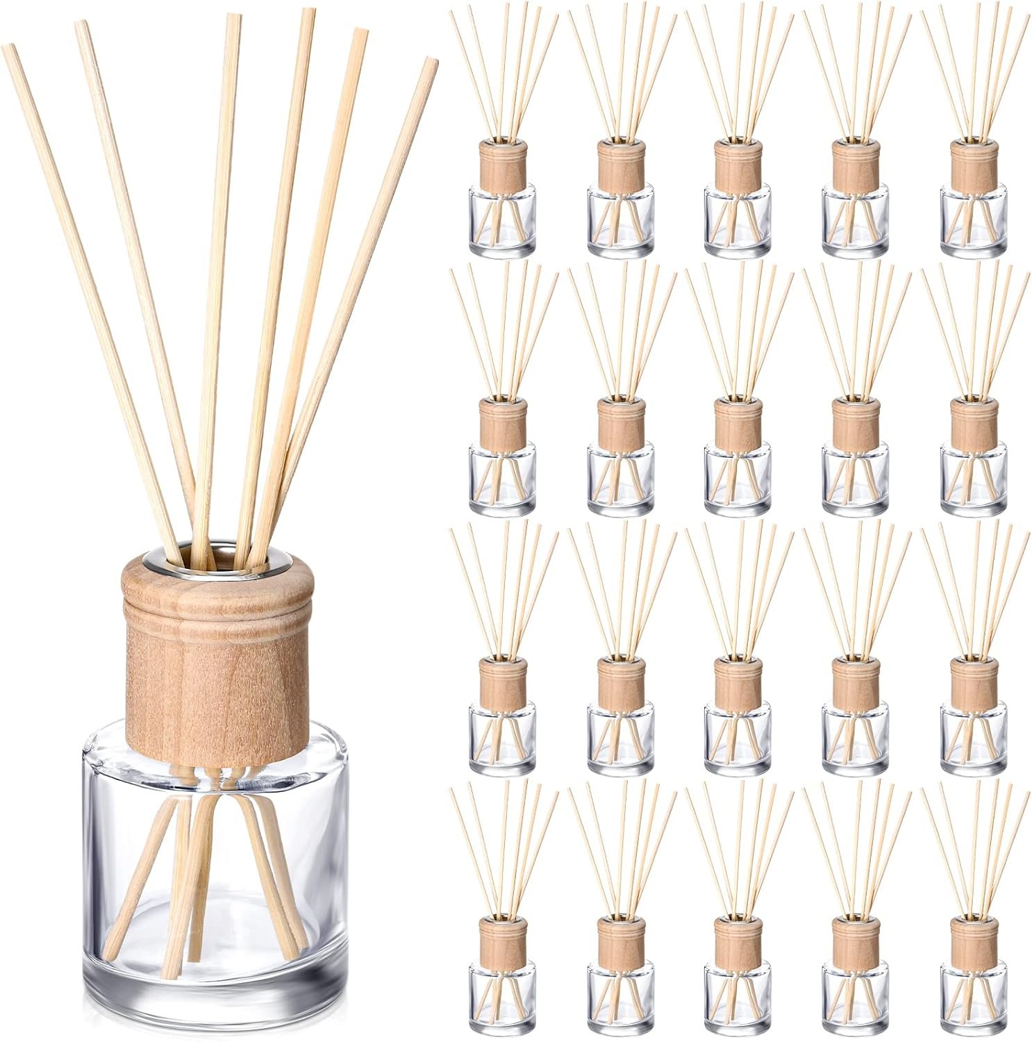 Reed Diffuser Kit: the package contains 20 sets of reed diffusers with sticks, including 20 empty glass diffuser bottles, 20 internal plugs, 20 wooden lids, and 120 wood colored sticks, which can meet your various needs, ideal for DIY projects and crafts, or as decorations for your home, office or spa
