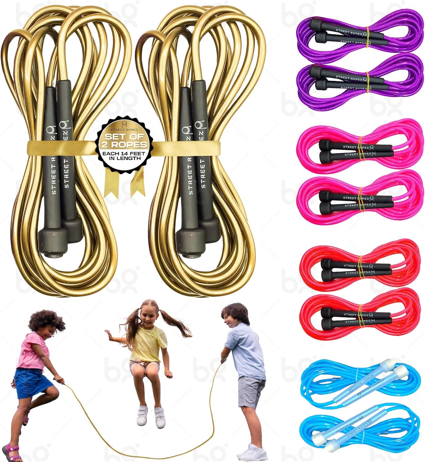Elevate your double dutch game with the Street Ropez Royalty Ropes! Step up your fitness routine and look like double dutch royalty with these premium jump ropes. The Royalty Ropes are built to last, with adjustable handles that give you total control as you turn the ropes. Crafted from a special material, these ropes won’t get blown around, so you can focus on nailing your tricks. Whether you’re an experienced jumper or just starting out, the 14-foot length provides ample room for 3-4 people to jump together. Elevate your double dutch skills and have a blast staying fit with the Street Ropez Royalty Ropes. Whether you’re an experienced double dutch champion or just starting to learn, the Royalty Ropes will elevate your skills, fitness, and confidence to new heights.