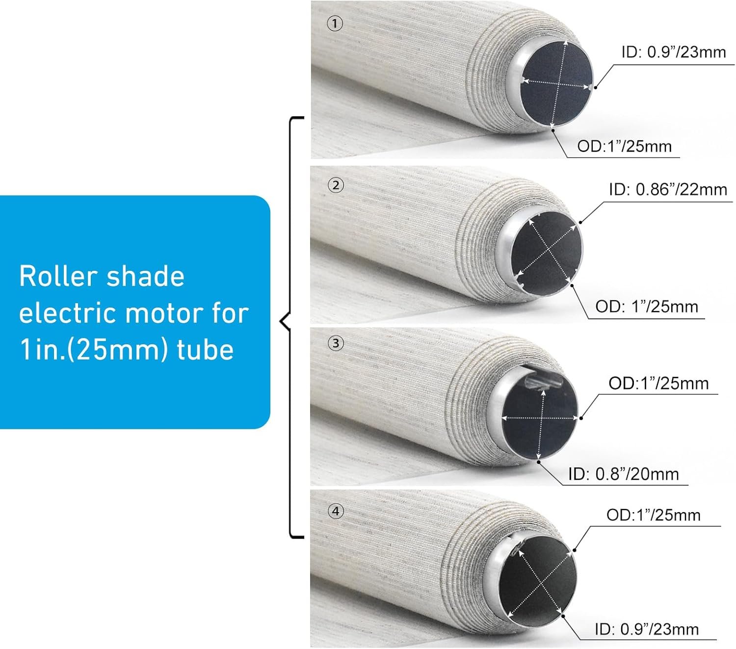 DC12V Blinds Motor Compatibility– Motor tube Φ 16mm/0.63 in. and drive fittings upgrade your existing normal blinds (Tube Size OD 1in./25mm), automate existing blinds for Blinds, Shades of horizontal blinds, Motorized Roller Shades, mini blinds, Not compatible with aluminum blinds,vertical blinds