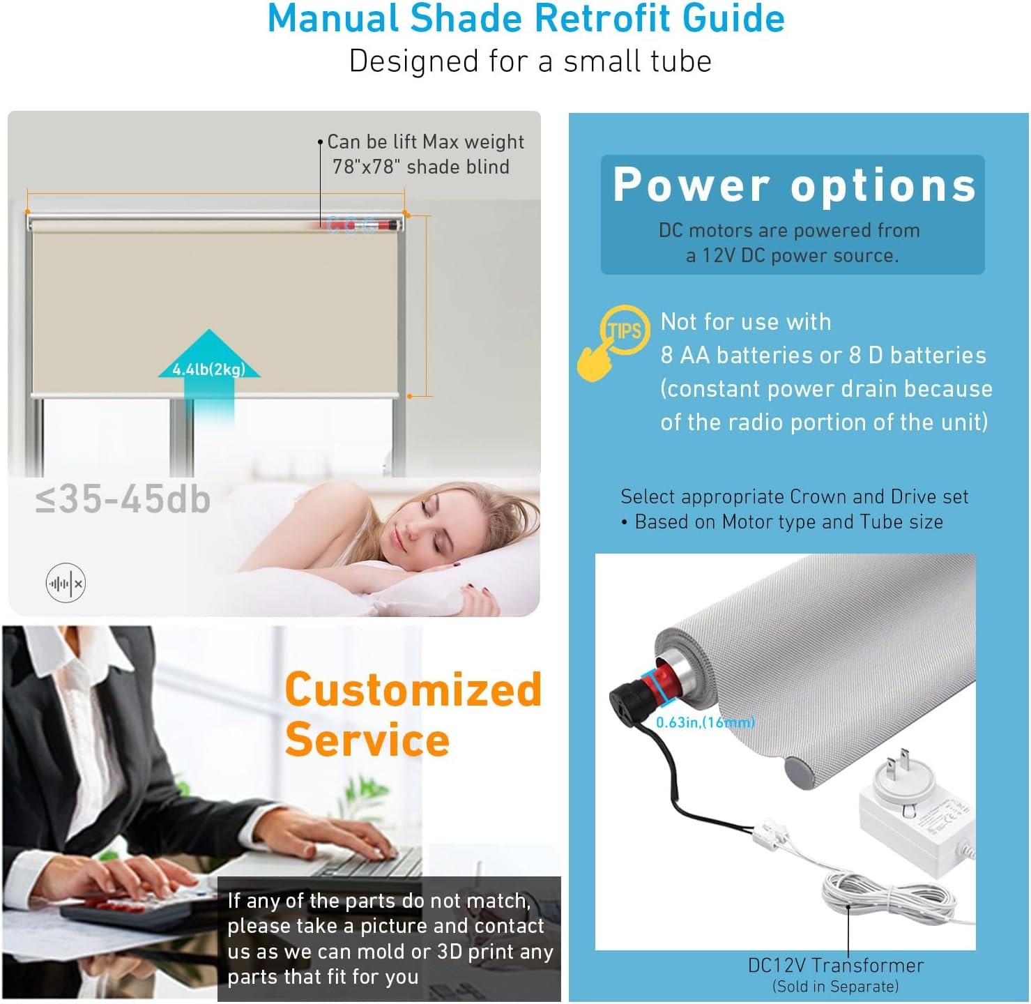 Retrofit motors in window shade tubes for 1in,(25mm) or 1-1/8in.(28mm) OD shade tube, use your house current and a 12 DC adapter, not working for 8 AA batteries or 8 D batteries.