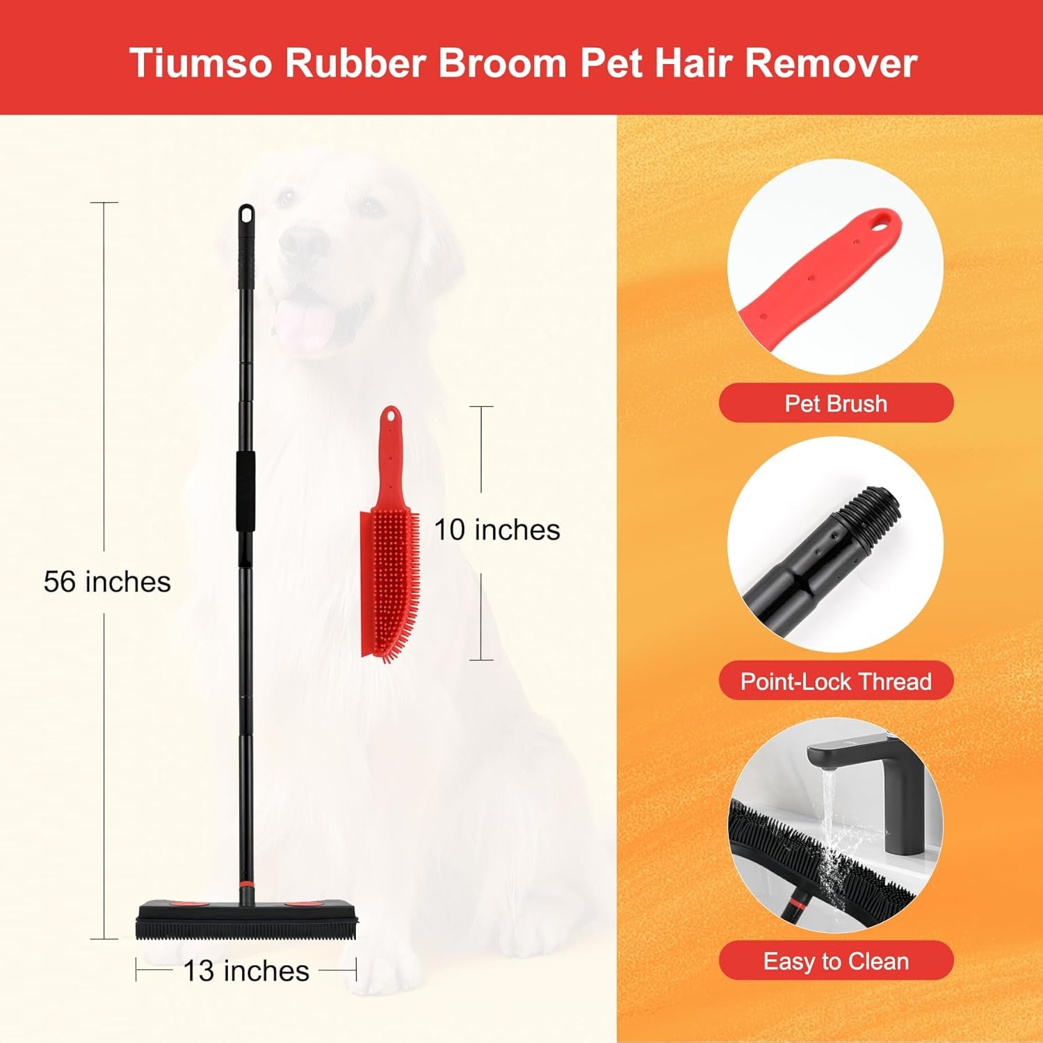 Comfortable and Adjustable Pole: No More Bending! No Longer Loose! Tiumso pet hair broom offers an adjustable handle from 34″ to 56″ for people of different heights. With the Tiumso Upgrade Point-Lock Thread Pole, say goodbye to loosening! EVA foamed-grip pet broom provides a comfortable and non-slip grip. Get ready to fall in love with our soft EVA grip.