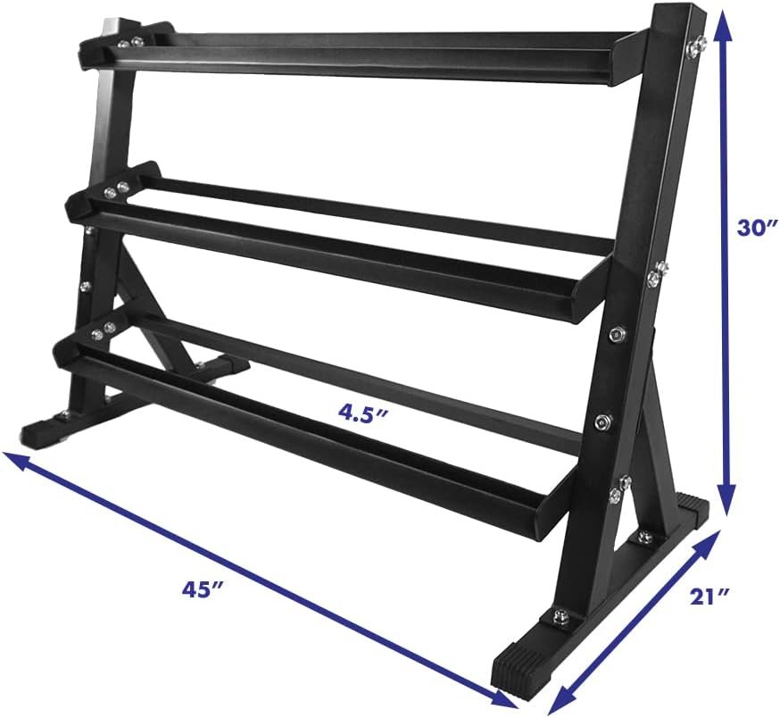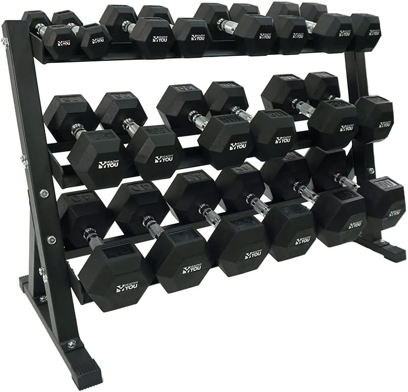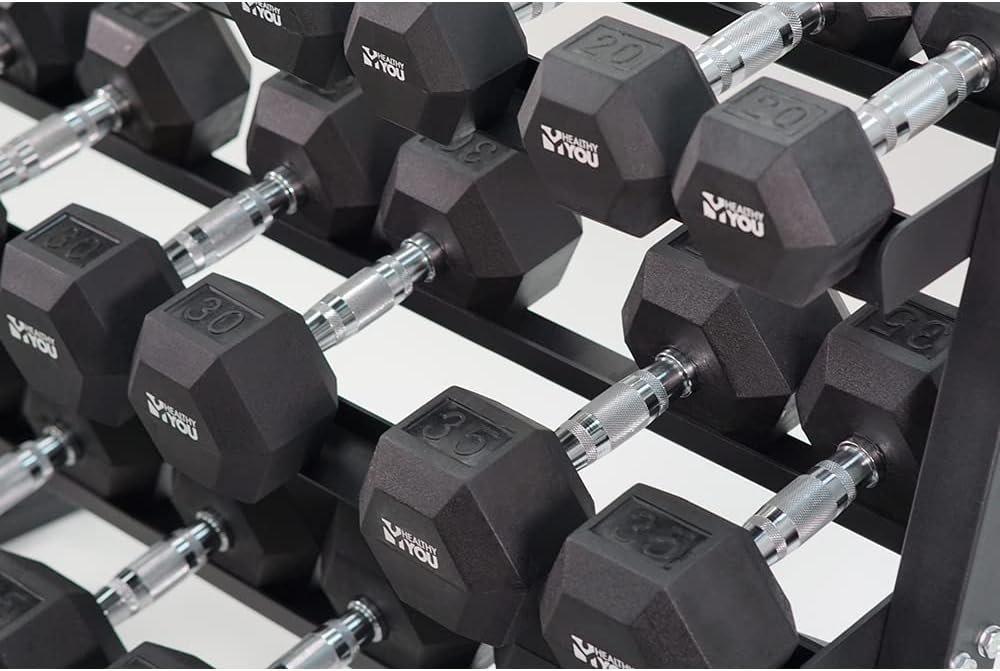 The Healthy You Rubber Hex Dumbbell Complete Set is an economical solution for physical therapy and strength training. The package includes a 3-tiered rack along with 2 each of 5 through 50 lb. dumbbells. The heavy-duty rack is constructed with a powder-coated finish on a steel frame. The Rubber Hex dumbbells feature an ergonomic and textured chrome handle for a comfortable secure grip. The hexagon-shaped rubber-encase ends help prevent rolling and simplify storage. Keep your budget healthy and save big on this complete package set when compared to purchasing all the items separately. Like all Healthy You brand products the professional level quality ensure they can withstand heavy duty clinical use but are also perfect for at home exercise and fitness.