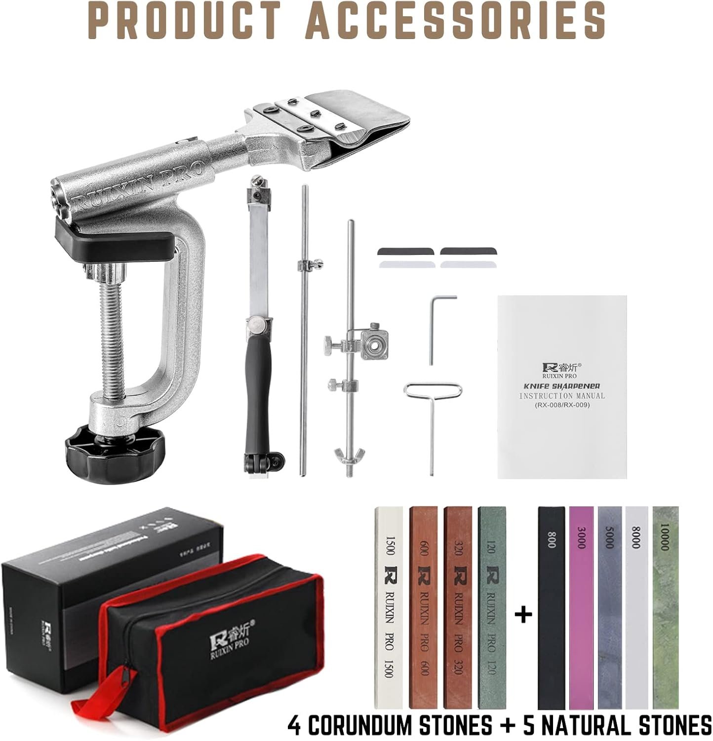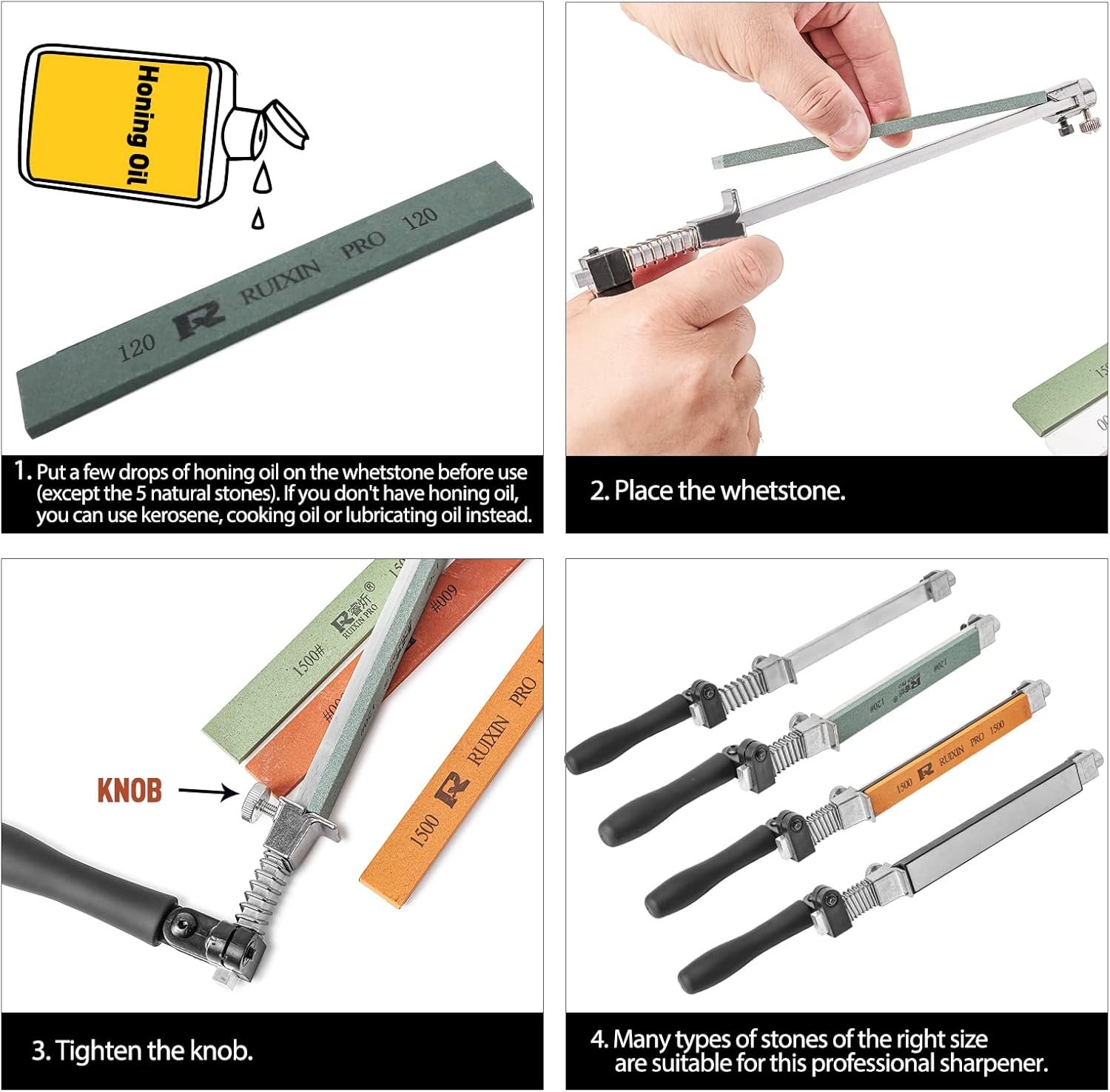 【9 Premium Quality Whetstones】 This Edge Sharpener Pro RX-008 Knife Sharpening Kit comes with 9 high quality whetstones: 4 corundum stones: 120#, 320#, 600#, 1500#, 5 natural stones: 800#, 3000#, 5000#, 8000#, 10000#. The smaller grit, the rougher surface, suitable for repairing a wide range of knives and tools, restoring Old/New knives. The higher grit, the smoother surface, can help to polish your knife, fine grinding, very sharp blades. Stones are all hard enough to grind S30V steel.