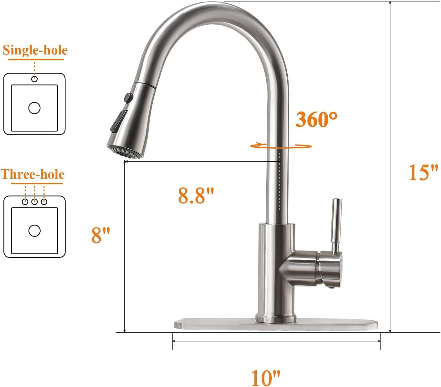 DIMENSION: Overall Height: 15” Spout Height: 8” Spout Reach: 8.8” High-arc spout swivels 360 Degrees for maximum sink access. 1 Or 3-hole 10″ installation (Optional escutcheon included) Flow rate: 1.8 GPM