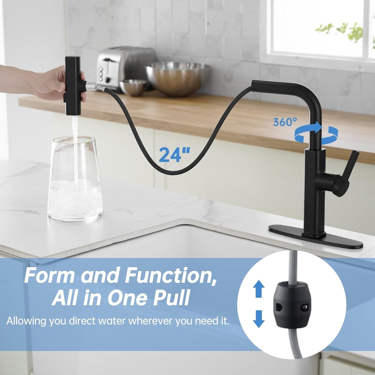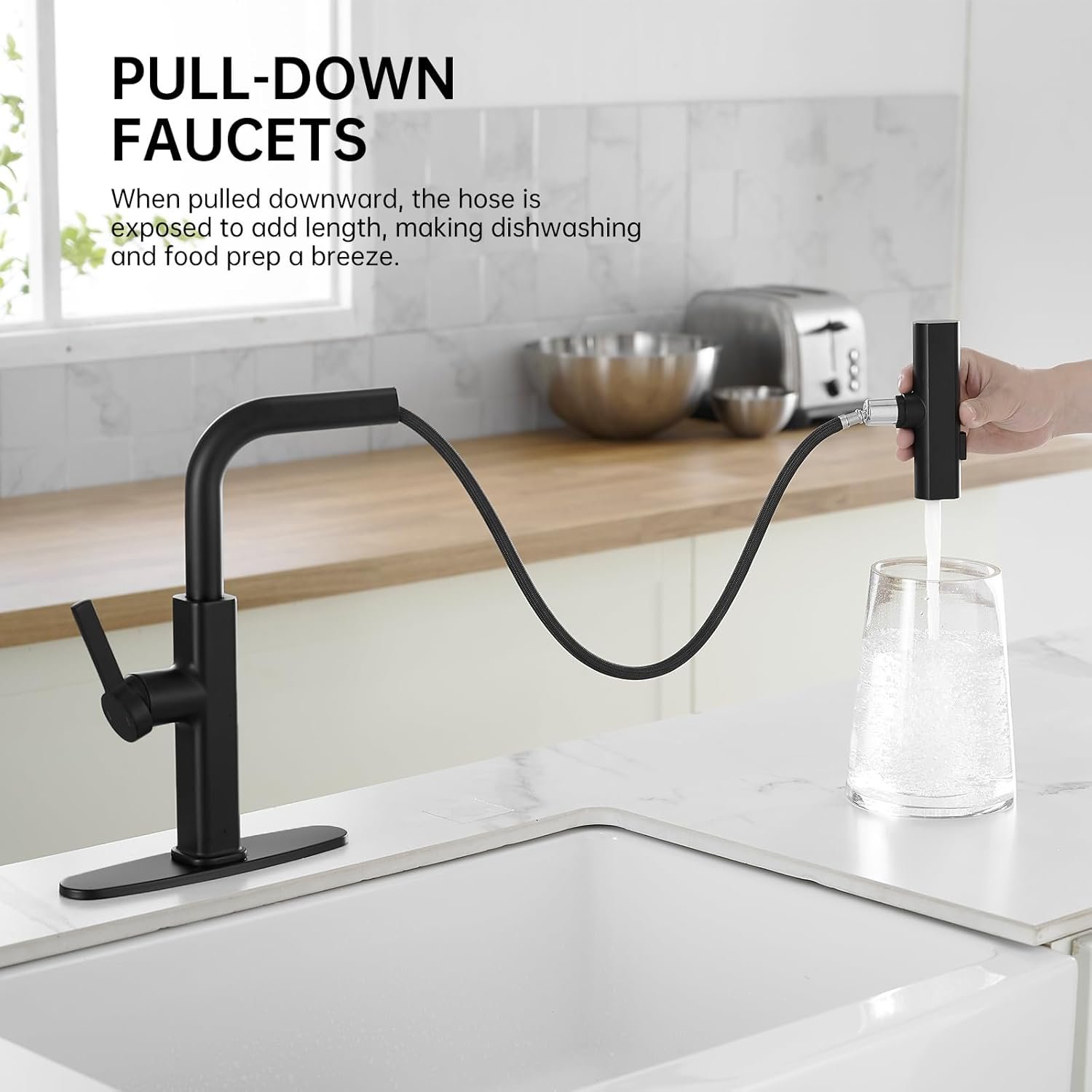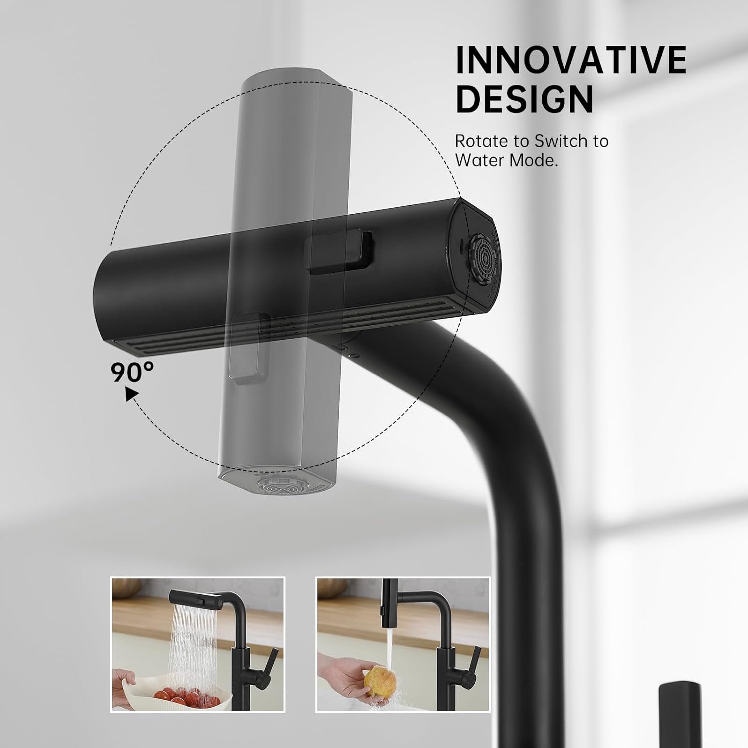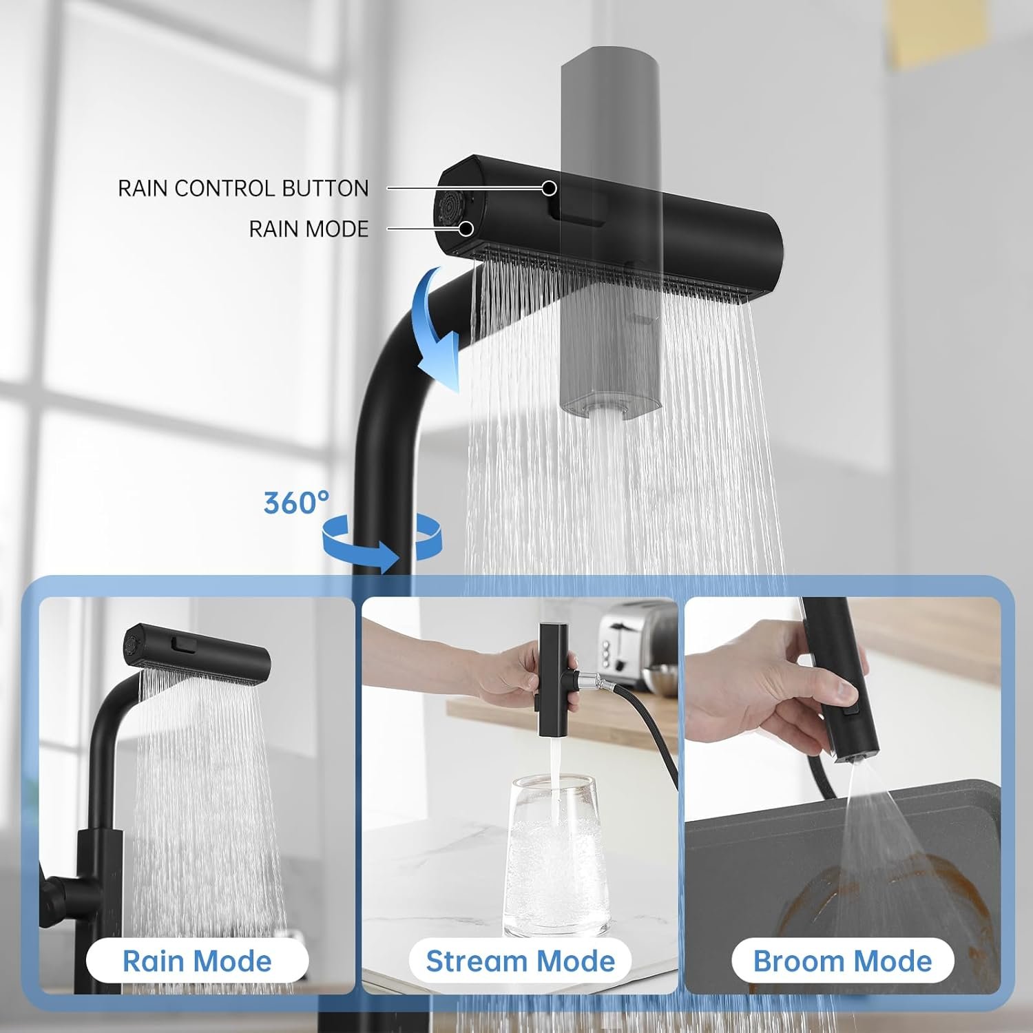 3 Modes Spray: The black kitchen faucet has 3 modes spray. Rain Mode is wide cleaning range for quick rising of sinks and foods. Broom mode is powerful water jet for all stains. Stream mode is soft water flow, no splashing, suit for daily cleaning.