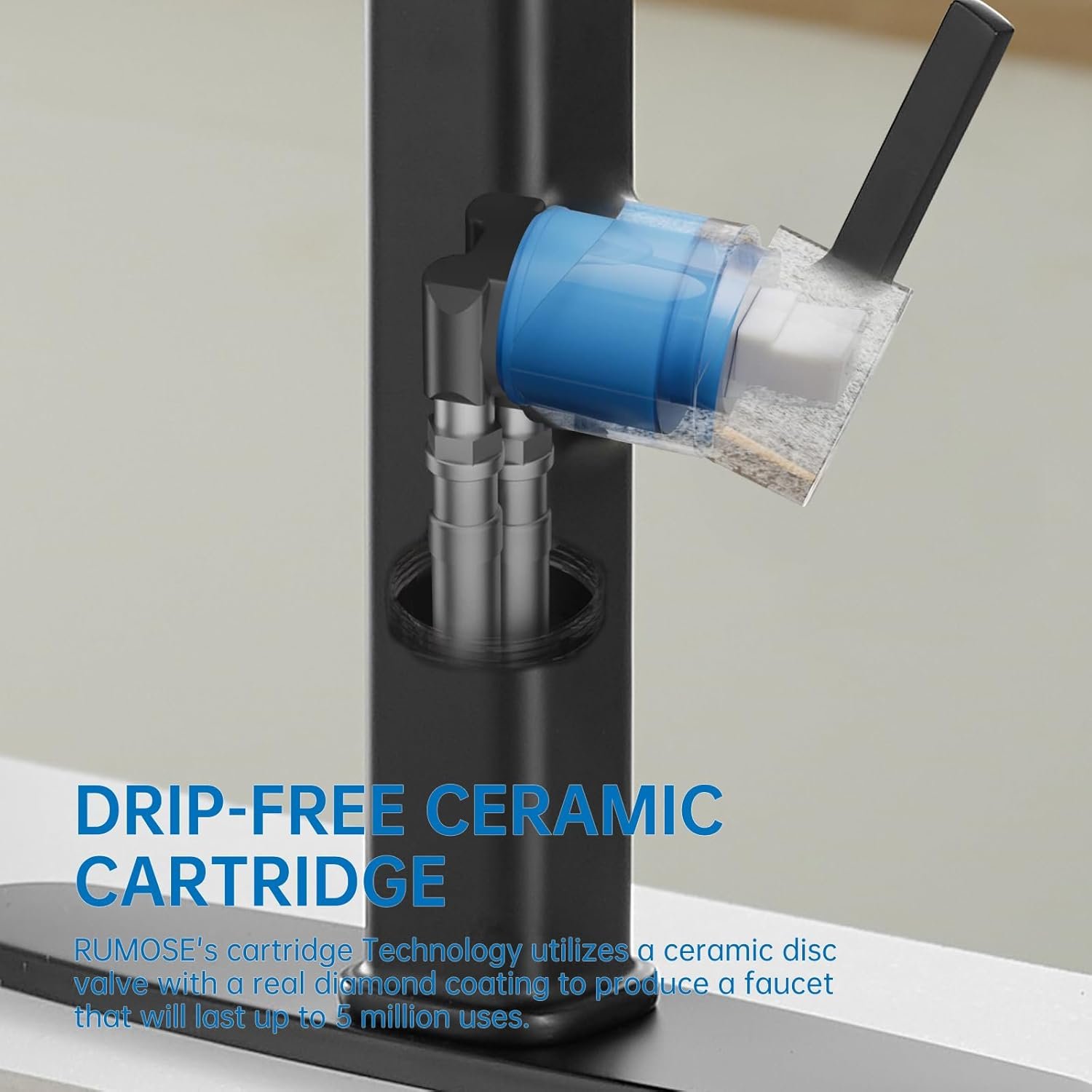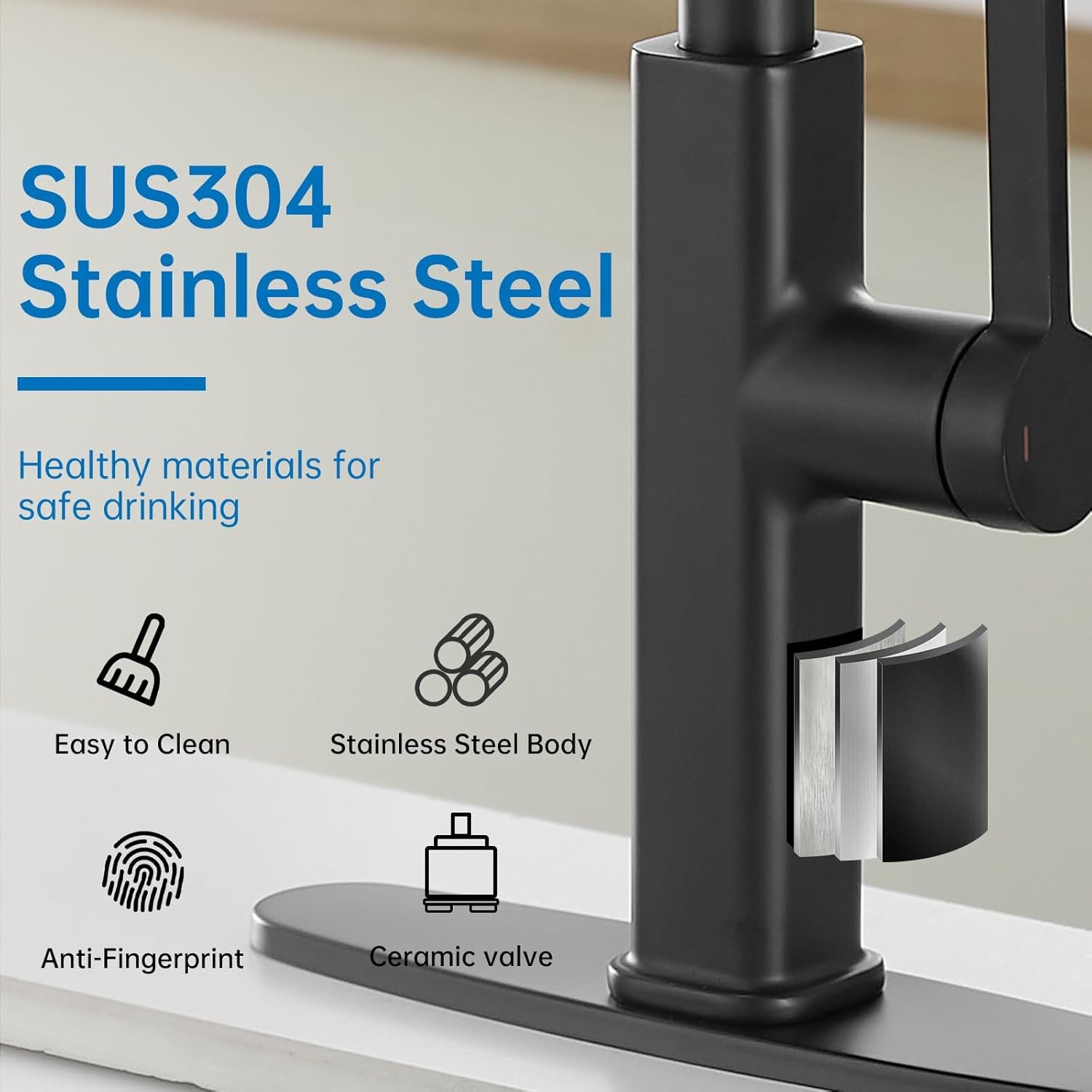 Premium Material: Our pull-down kitchen faucet is made of SUS304 stainless steel. It’s black finish is anti rust and proof corrosion, more durable. And the ceramic cartridge valve has undergone 500,000 water tightness tests which is not easy to leak.