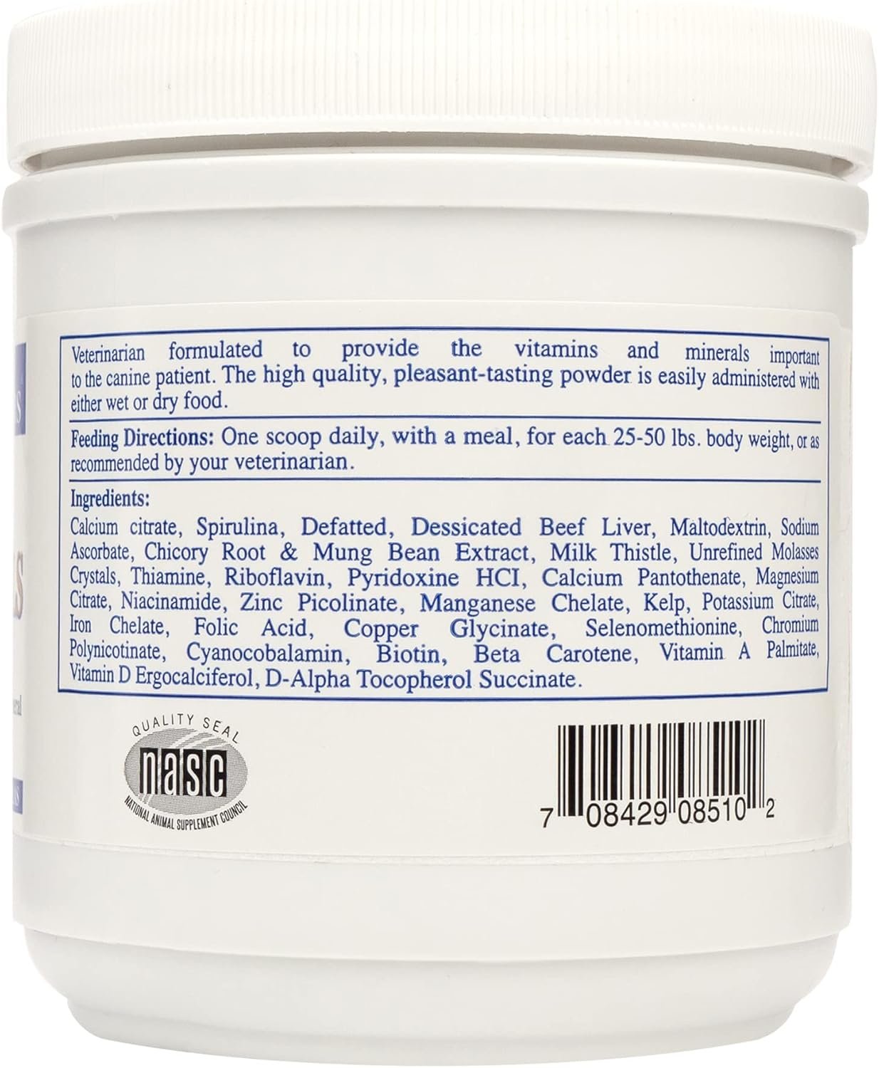 Rx Vitamins’ Rx Essentials for Pets (Dogs) Powder is a tasty and balanced nutritional supplement that you can add to either commercial or homemade dog food. It provides: Calcium citrate for bone health; Spirulina‚ microscopic algae that supports your dog’s immune system and digestive health; Defatted‚ desiccated beef liver‚ which is rich in protein and iron; Malt dextrin‚ which is a carbohydrate that provides your dog with energy; Sodium ascorbate‚ a form of vitamin C that boosts immune system functioning; Chicory root‚ a prebiotic that encourages the growth of good bacteria in your dog’s digestive system; Mung bean extract‚ which is packed with nutrients and amino acids; Milk thistle‚ which supports your dog’s liver and immune system; Unrefined molasses crystals‚ which are rich in nutrients and may help relieve joint pain; Additional vitamins‚ minerals‚ and herbs‚ to ensure balanced nutrition: thiamine‚ riboflavin‚ pyridoxine‚ calcium pantothenate‚ magnesium citrate‚ niacin amide‚ zinc picolinate‚ manganese chelate‚ kelp‚ potassium citrate‚ iron chelate‚ folic acid‚ copper‚ selenomethionine‚ chromium‚ cyanocobalamin‚ biotin‚ beta carotene‚ vitamin A‚ vitamin D‚ d-alpha tocopherol succinate. Add 1 teaspoon of Rx Essentials for Pets (Dogs) to your dog’s food for every 25 to 50 pounds of his or her weight each day‚ unless otherwise recommended by your veterinarian. These statements have not been evaluated by the Food and Drug Administration (FDA). These products are not meant to diagnose‚ treat or cure any disease or medical condition. Please consult your doctor before starting any exercise or nutritional supplement program or before using these or any product during pregnancy or if you have a serious medical condition.