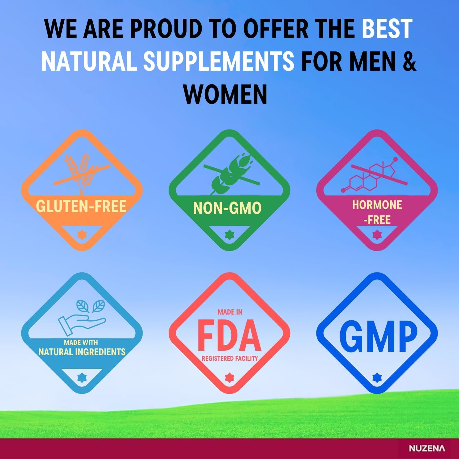 NUZENA offers a line of natural supplements that not only exceed all industry-standard testing, but that also meet our own internal quality certification requirements developed by registered dietitians, food scientists and other health professionals.