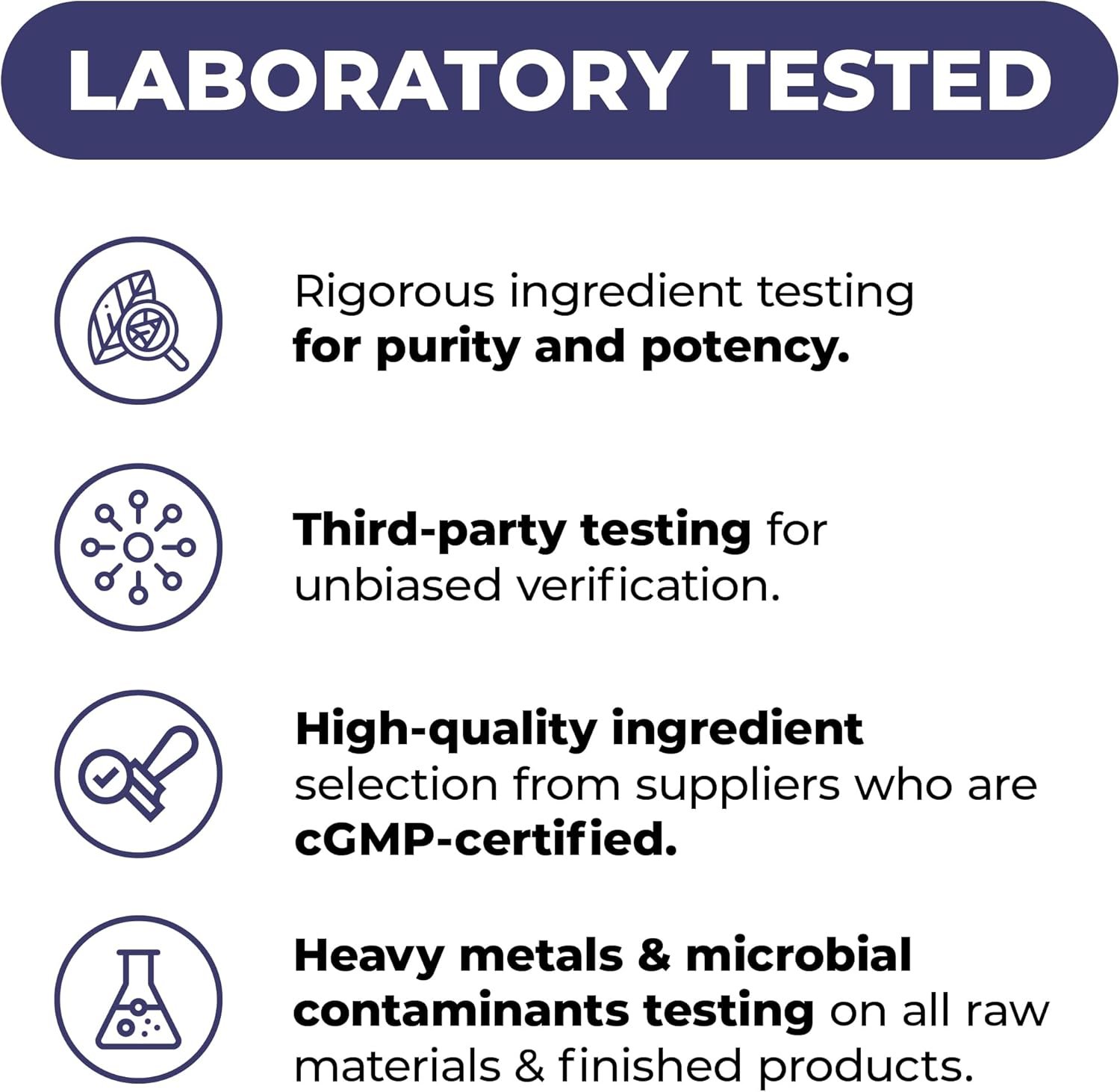 We conduct thorough quality tests during production to ensure each product’s purity and potency. Ingredients are chosen only from suppliers adhering to Stringent Industry Standards and cGMP.