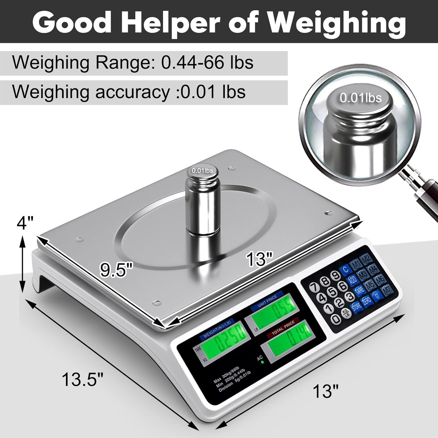 ⚖️ KG/LBS Conversion Button: Our commercial digital scale allows units to be switched from kg to lbs, catering to different weighing needs. The price scale features 3 display windows for weighing, unit weighing, and counting.