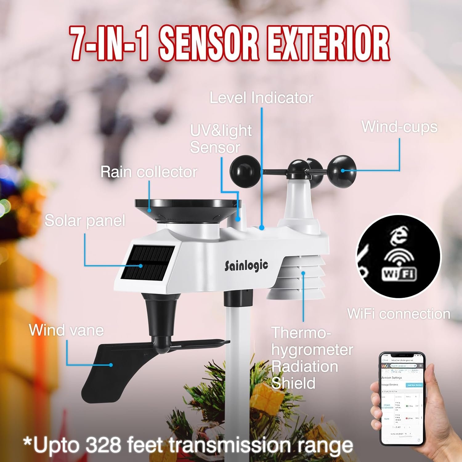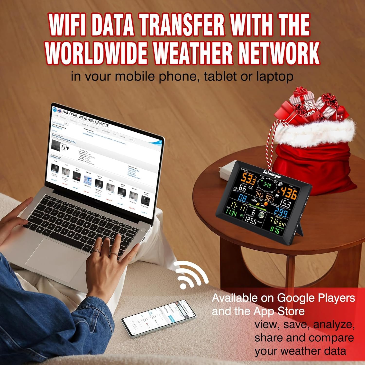 𝗪𝗜𝗙𝗜+𝗪𝗲𝗮𝘁𝗵𝗲𝗿 𝗨𝗻𝗱𝗲𝗿𝗴𝗿𝗼𝘂𝗻𝗱+𝗪𝗲𝗮𝘁𝗵𝗲𝗿𝗖𝗹𝗼𝘂𝗱+𝗔𝗣𝗣-Connect to WU (Weather Underground) or WeatherCloud. WU allows you to view, save, analyze, share and compare data from local personal weather stations with beautiful, customizable charts and graphs. Once you connect your station and report back to W-Underground, you will receive data hosting services and member benefits.Download and install the “sainlogic” app to track your weather conditions and historical data.
