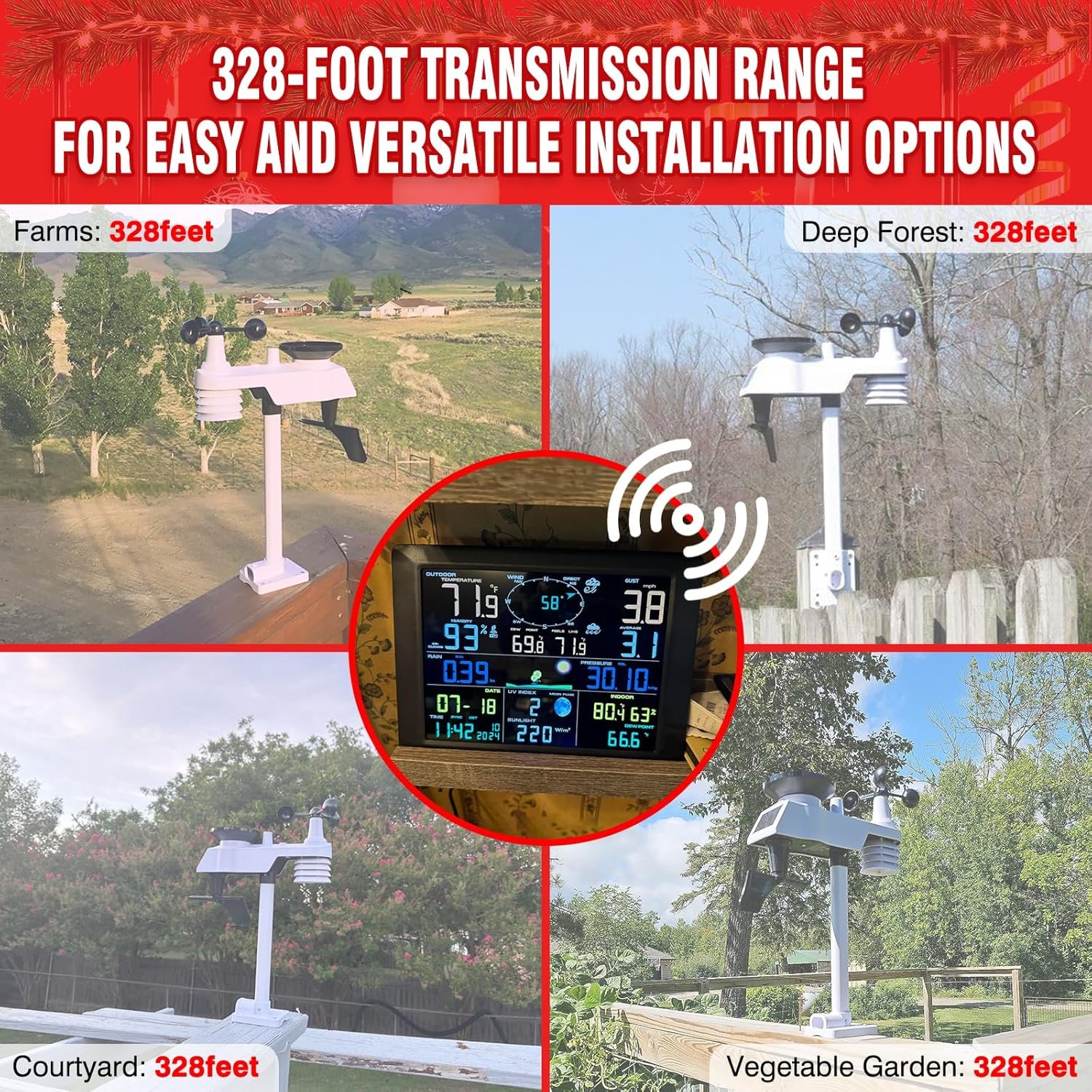 𝟳-𝗶𝗻-𝟭 𝗢𝘂𝘁𝗱𝗼𝗼𝗿 𝗦𝗲𝗻𝘀𝗼r-The outdoor sensor consists of rain funnel, solar panel and transmission module, wind vane and high-speed anemometer. Long range wireless sensors connect to the console up to 328 feet away. Most applications are limited to 100 feet due to buildings, walls, and interference and the wireless signal will not pass through solid metal. The main power source for the sensor is a solar panel, and the sensor array requires 3 AAA batteries (not included).