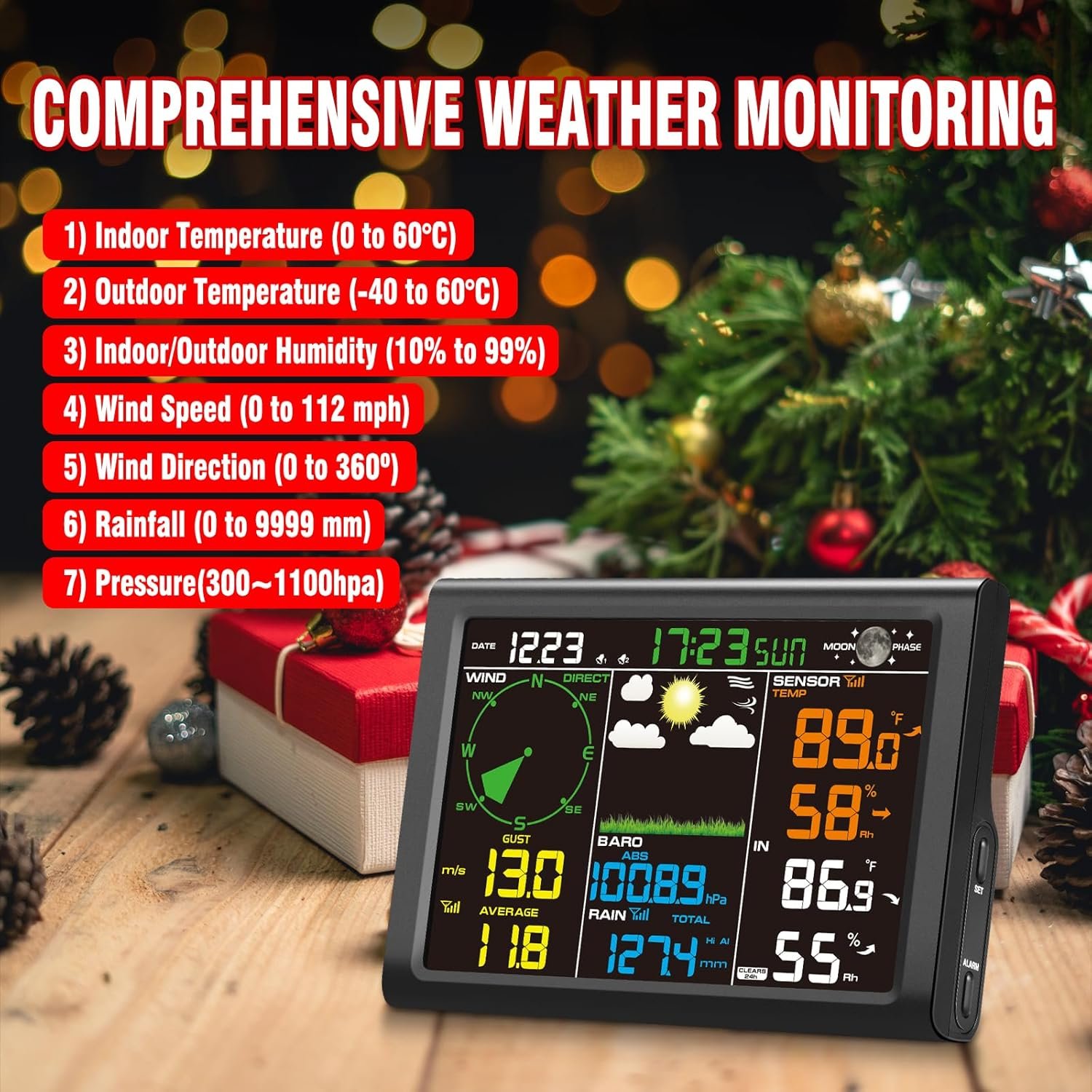 【Comprehensive Weather Monitoring】This weather station tracks real-time data, including rainfall, wind speed, wind direction and pressure (300-1100 hPa). It monitors humidity (10%-99%) and temperature (indoor: 0°C-60°C; outdoor: -40°C-60°C) and so on