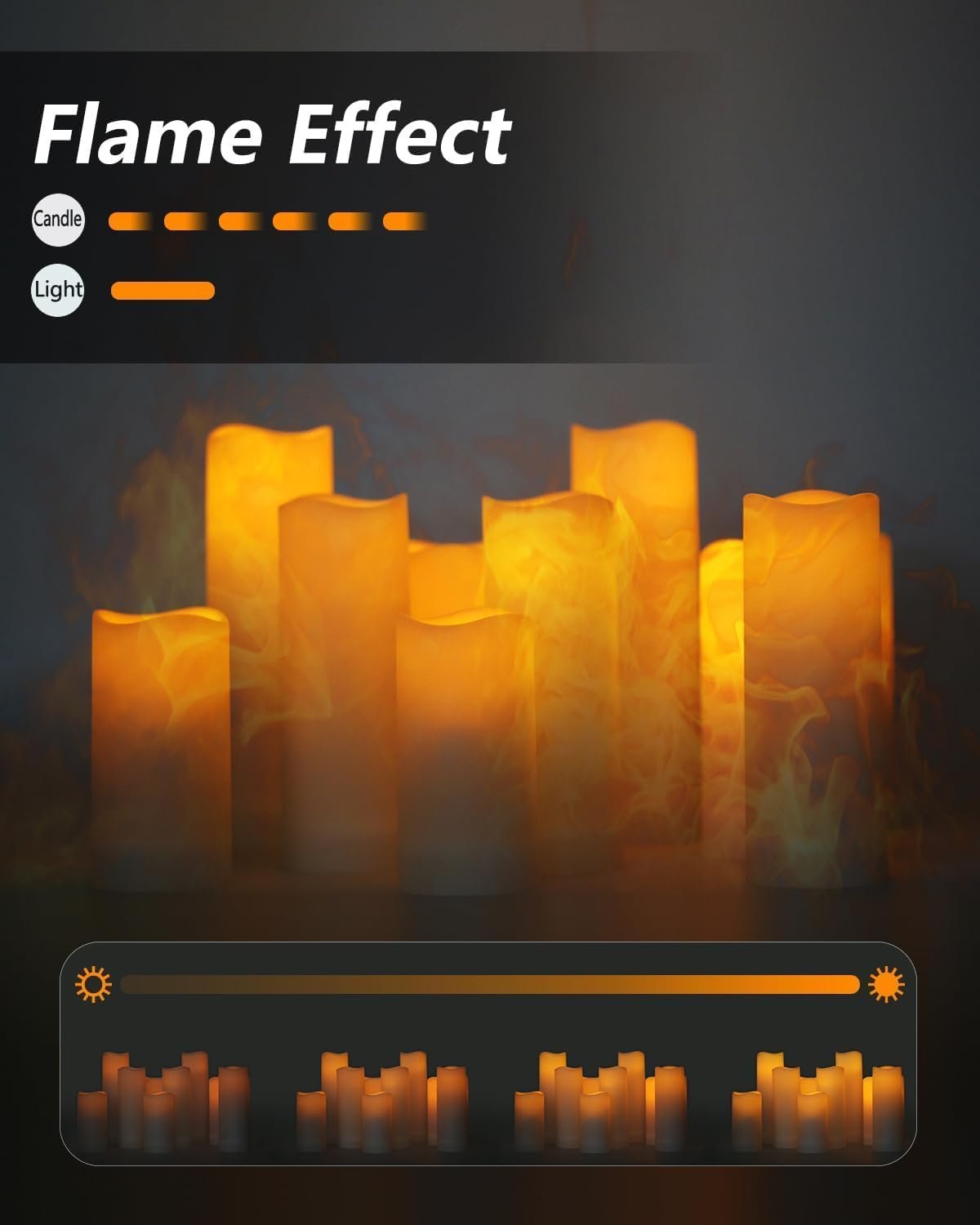 Incredibly realistic flickering flame LED Candle, Warm Yellow flame simulation technology makes the candles and flicker so convincingly. Two 4″, Three 5″, Three 6″, Two 7″ height battery operated pillar candles (each 2.2″ diameter)