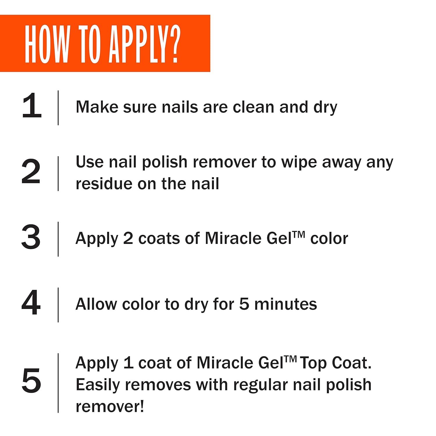 The ONLY TRUE 2-STEP GEL MANICURE with no light needed. Over 60 shades that wow! and it’s only from Sally Hansen. Leading the revolution in gel technology. For Best Results: Make sure nails are clean and dry. Use nail polish remover to wipe away any residue on the nail. Step 1: Apply 2 coats of Miracle Gel Color. Allow color to dry for 5 minutes. Step 2: Apply 1 coat of Miracle Gel Top Coat. Let natural light do the rest.