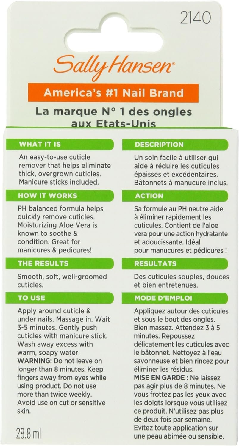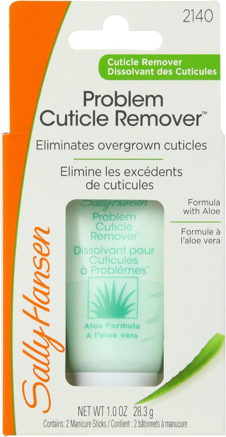 Problem cuticle remover aloe formula eliminates thick, overgrown cuticles. Ph balanced formula helps quick,ly remove cuticles. Moisturizing aloe conditions for visibly smoother, healthy-looking cuticles. Contains 2 natural wood manicure sticks to gently ease back cuticles. Salon tested-dermatologist tested.