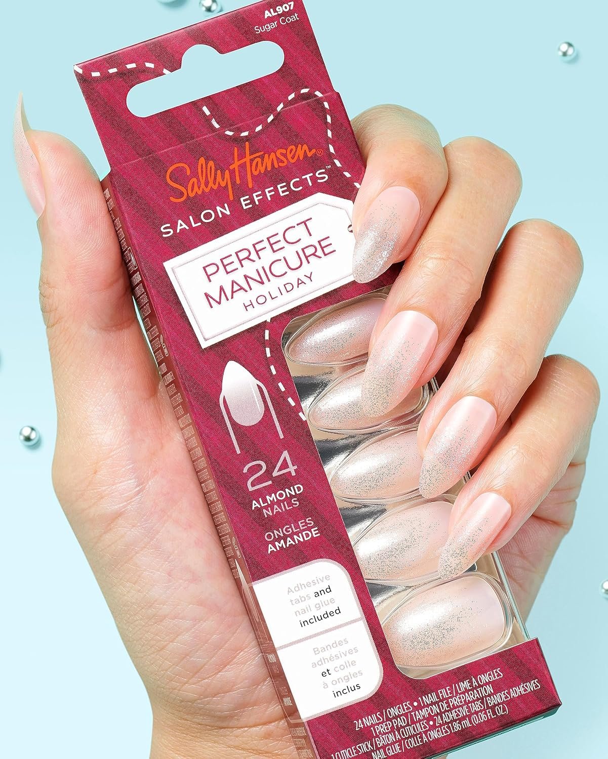 No cookie cutter nails here! Bring home the salon this holiday season with our Salon Effects Perfect Manicure in a NEW festive design! Twinkle and sparkle with this limited-edition set of ready to wear nails, inspired by sugary holiday sweets. Upgrade your mani with our almond-shaped nails that have a natural base and a gradient glitter texture at the tips, to add a subtle, yet sweet glimmer. You don’t need to be born with beautiful nails to have them!