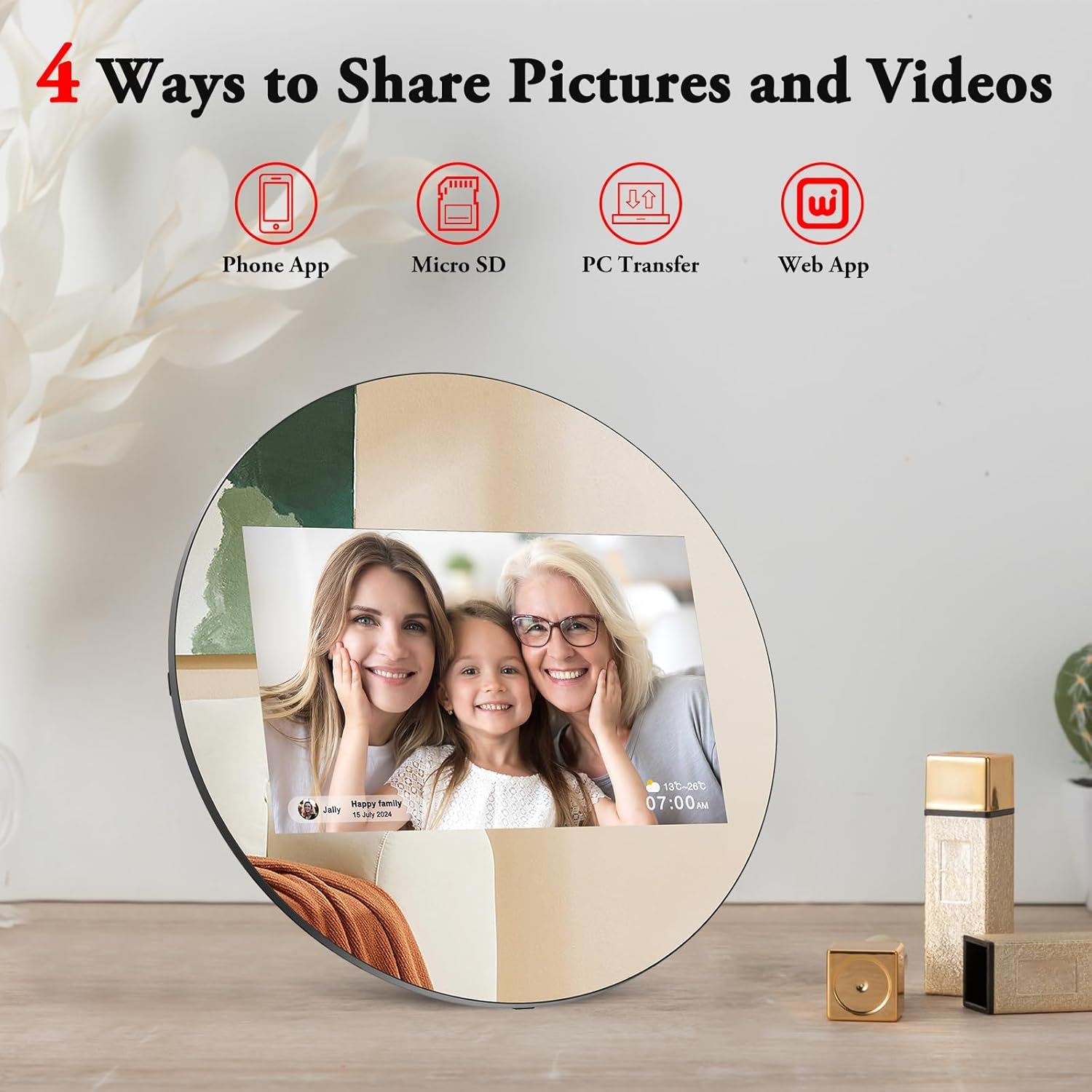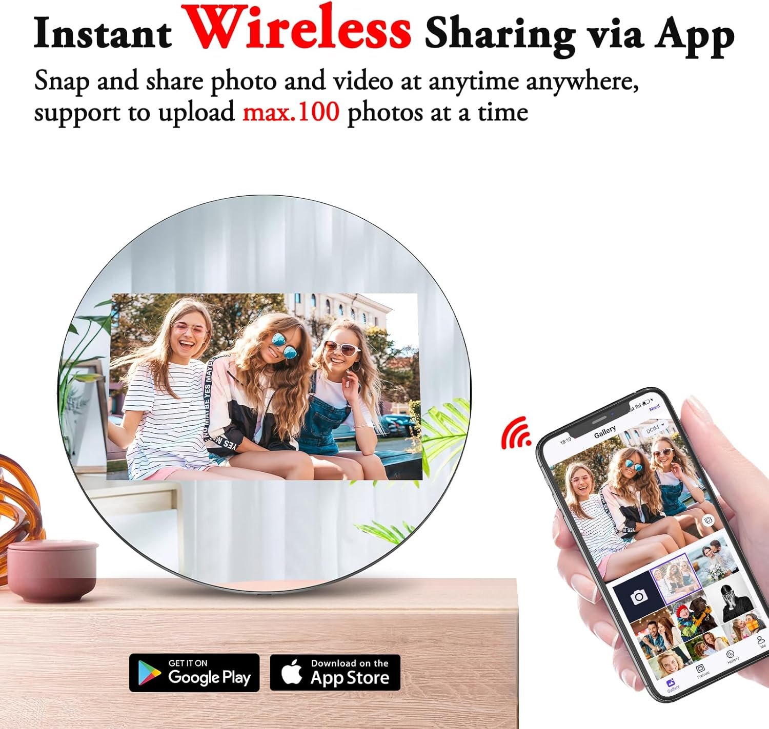 【Instant Wireless Sharing】: Support 2.4GHz and hidden WiFi, invite unlimited friends to share photos and video via App or Web App(500 photos at a time) from anywhere. App is lifetime free for Android and iOS. Once uploaded, photos will appear on the digital frame in seconds. Send instant or timed greeting card and pop-ups to frame via App. Nice for those who live in a distance.