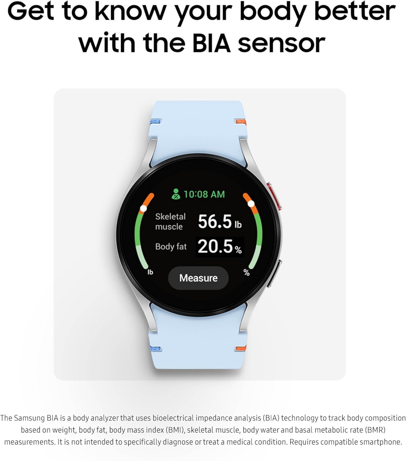 ¹Requires compatible smartphone. ²The Samsung BIA is a body analyzer that uses bioelectrical impedance analysis (BIA) technology to track body composition based on weight, body fat, body mass index (BMI), skeletal muscle, body water and basal metabolic rate (BMR) measurements. It is not intended to specifically diagnose or treat a medical condition. ³Galaxy AI features track data and require compatible Samsung Galaxy phone, Samsung Health app and Samsung Account. Available only for running workouts. Requires initial setup of 10 minutes of outside running with GPS on compatible smartphone and Samsung Health app version 6.22 or later. The heart rate software functions are not intended for use in the diagnosis of disease or other conditions, or in the cure, mitigation, treatment or prevention of disease. ⁴The ECG app is not intended for users with known arrhythmias other than atrial fibrillation or users under 22 years old. Users should not interpret or take clinical action based on the device output without consultation of a qualified healthcare professional. The ECG app is not intended to replace traditional methods of diagnosis or treatment. Requires compatible Samsung smartphone. ⁵Galaxy AI features track data and require compatible Samsung Galaxy phone, Samsung Health app and Samsung Account. Phone must be within 2 feet of user with snore detection enabled through Samsung Health app version 6.22 or later. ⁶Phone must be within 2 feet of user with snore detection enabled through Samsung Health app version 6.22 or later. ⁷4G LTE stand-alone connectivity only available on Samsung Galaxy Watch FE LTE / Galaxy Watch Ultra versions. Requires initial pairing with an eligible Android smartphone and separate qualifying wireless plan. Your carrier may not support stand-alone voice calling, or support may be available only in certain areas. Please check with your carrier for more information. Stand-alone functionality limited if paired phone is not powered on or connected to a wireless network. ⁸Select interchangeable watch bands and faces sold separately. ⁹Consistent with IP68 rating, water resistant in up to 5 feet of water for up to 30 minutes. Rinse residue / dry after wet.