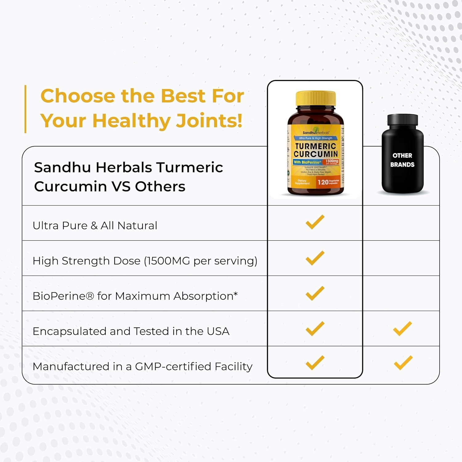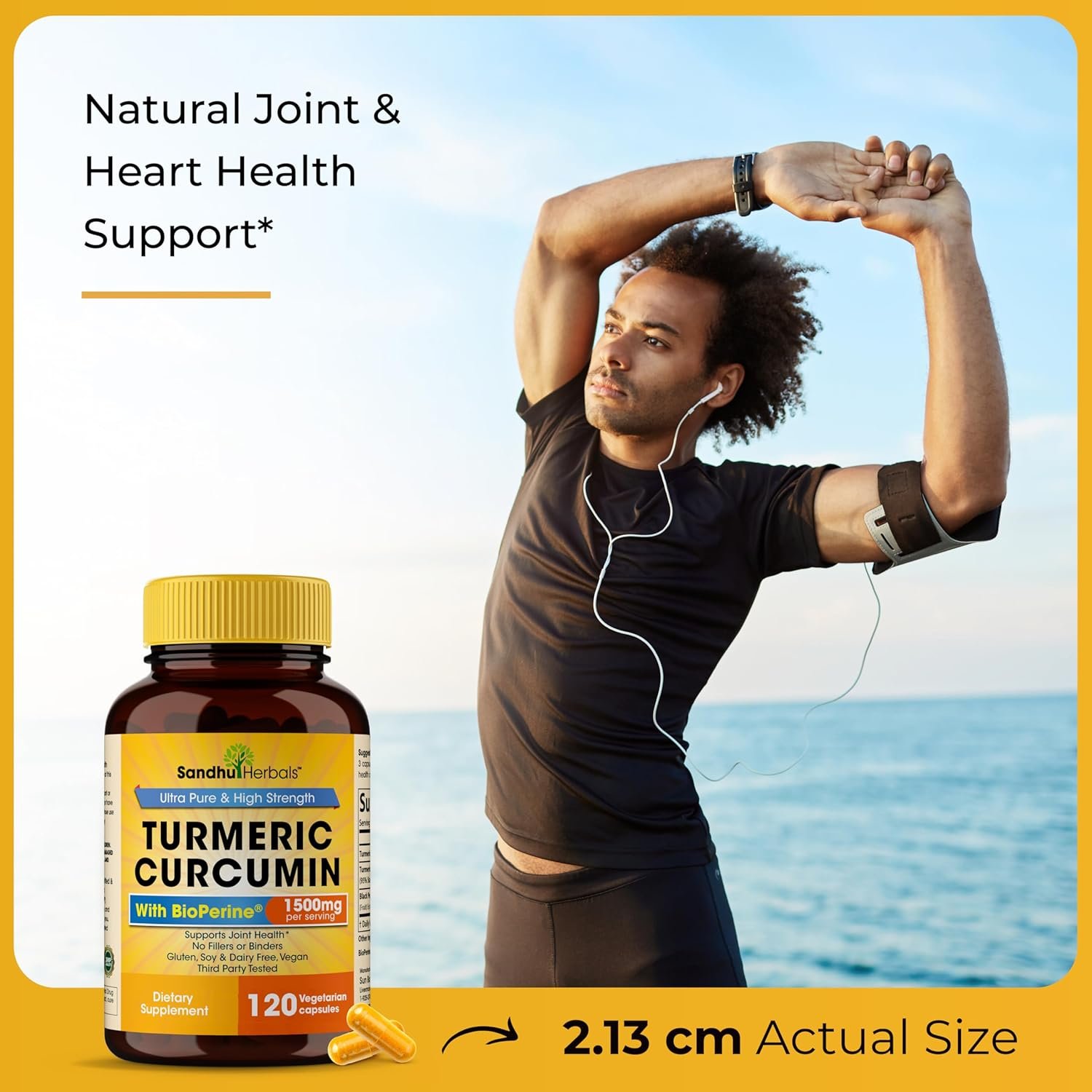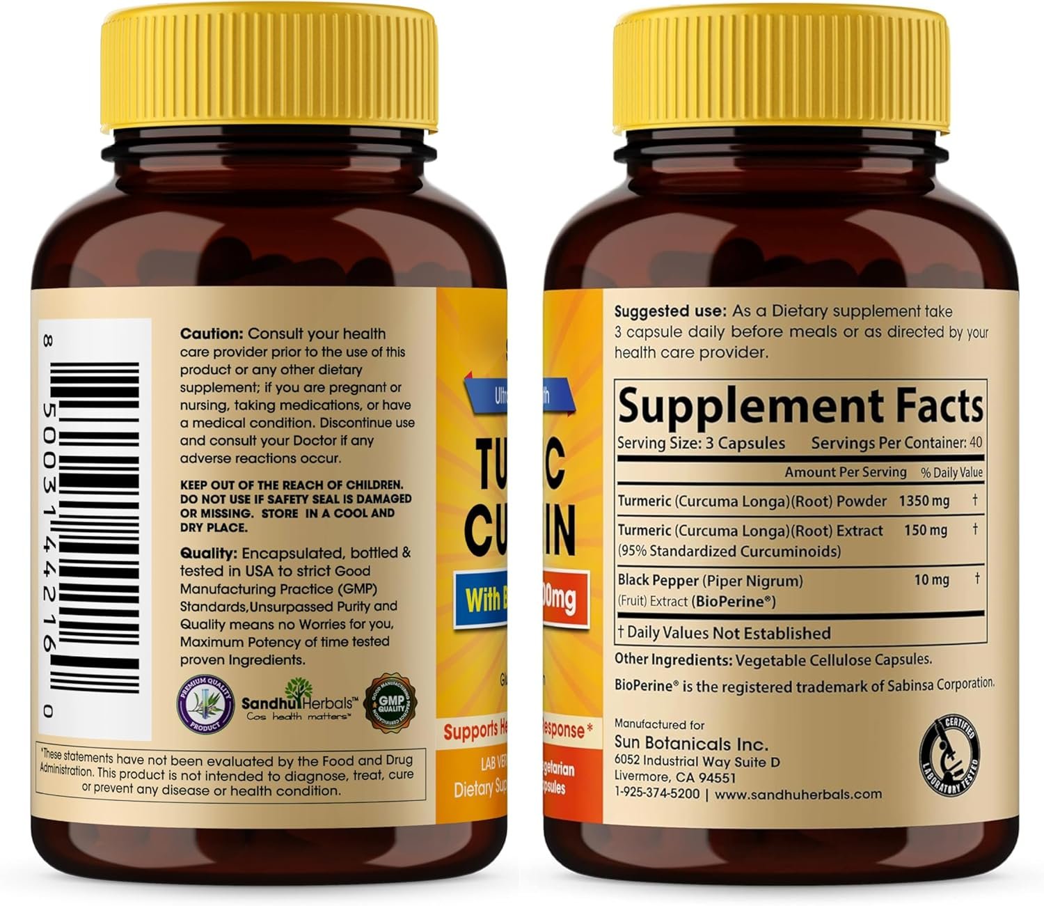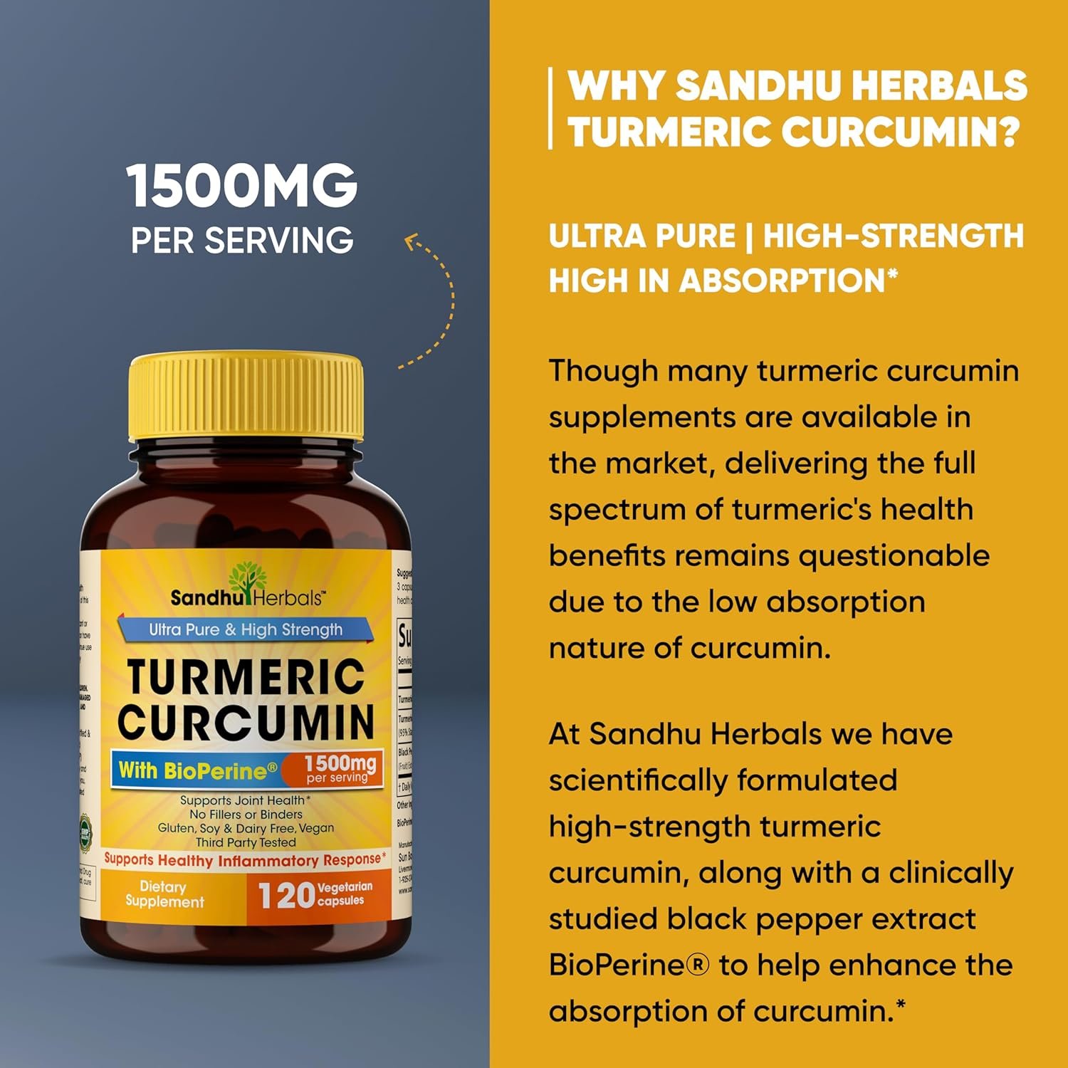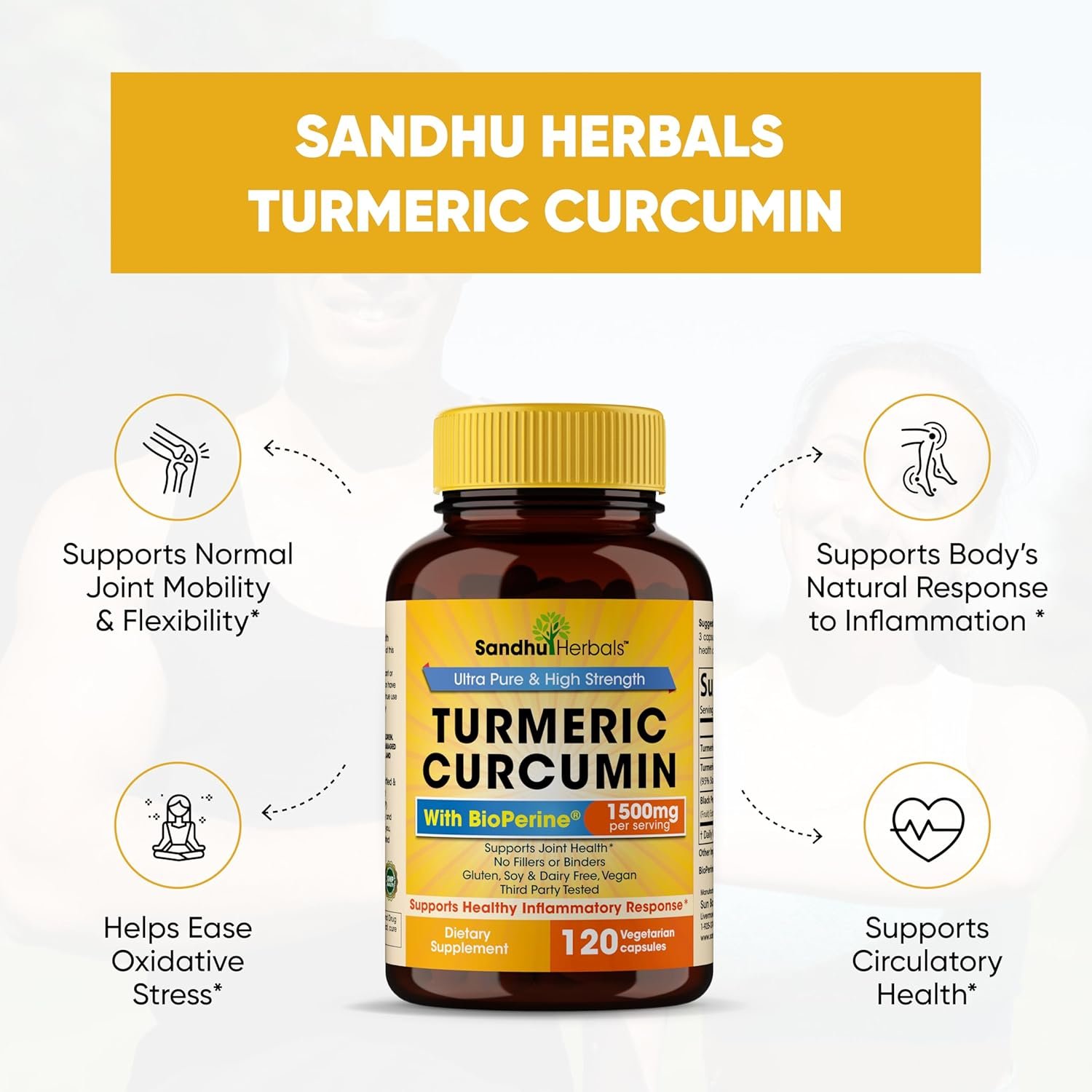 Sandhu Herbals Organic Turmeric Curcumin 120 Capsules with Bioperine Black Pepper Extract Supplement | 1500mg with 95% Curcuminoids | Immune Support