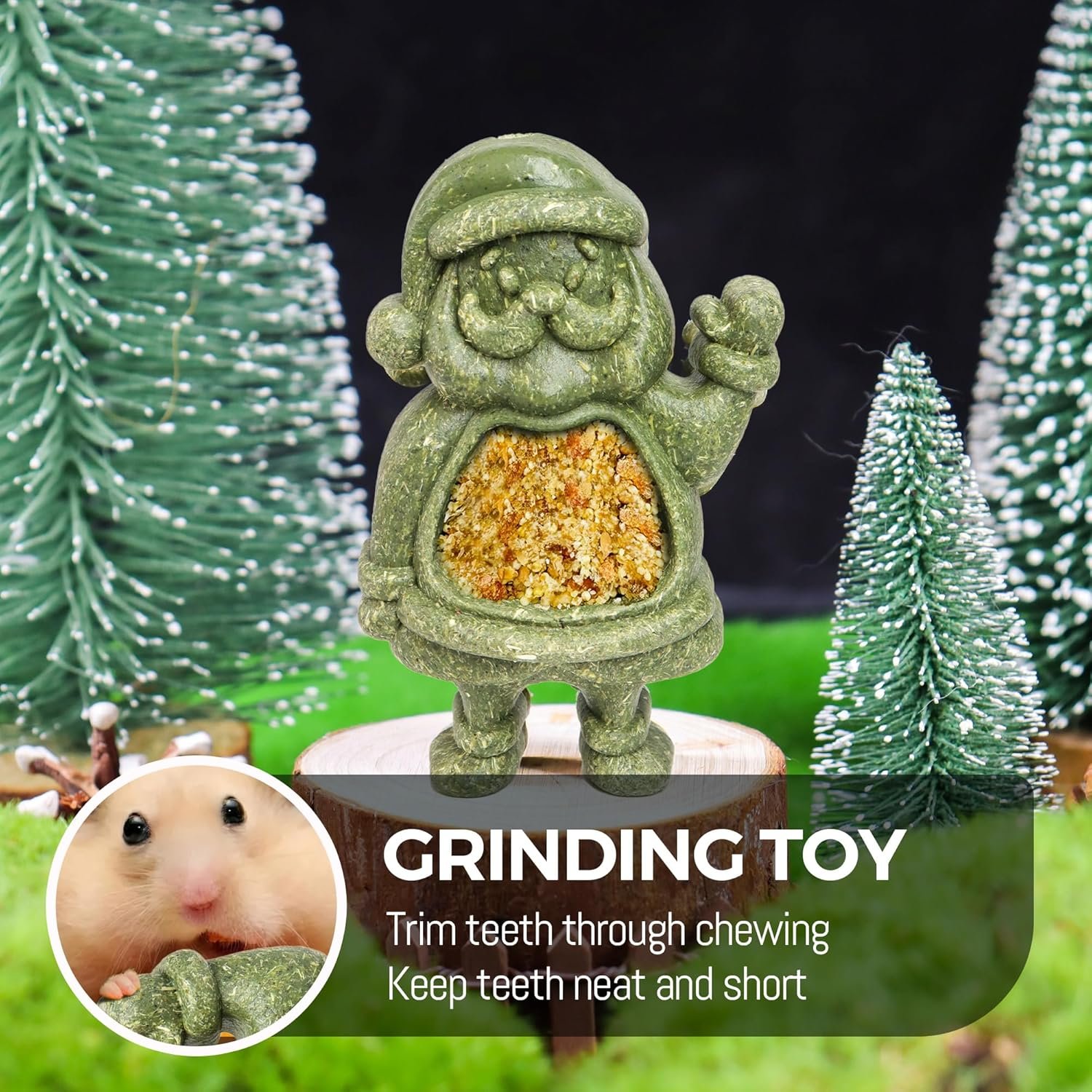 Rodents need to chew on to keep their teeth short.Offering chew toys is a natural way to prevent tooth overgrowth.The great durability and sturdiness of our Santa toys help chew their teeth down.