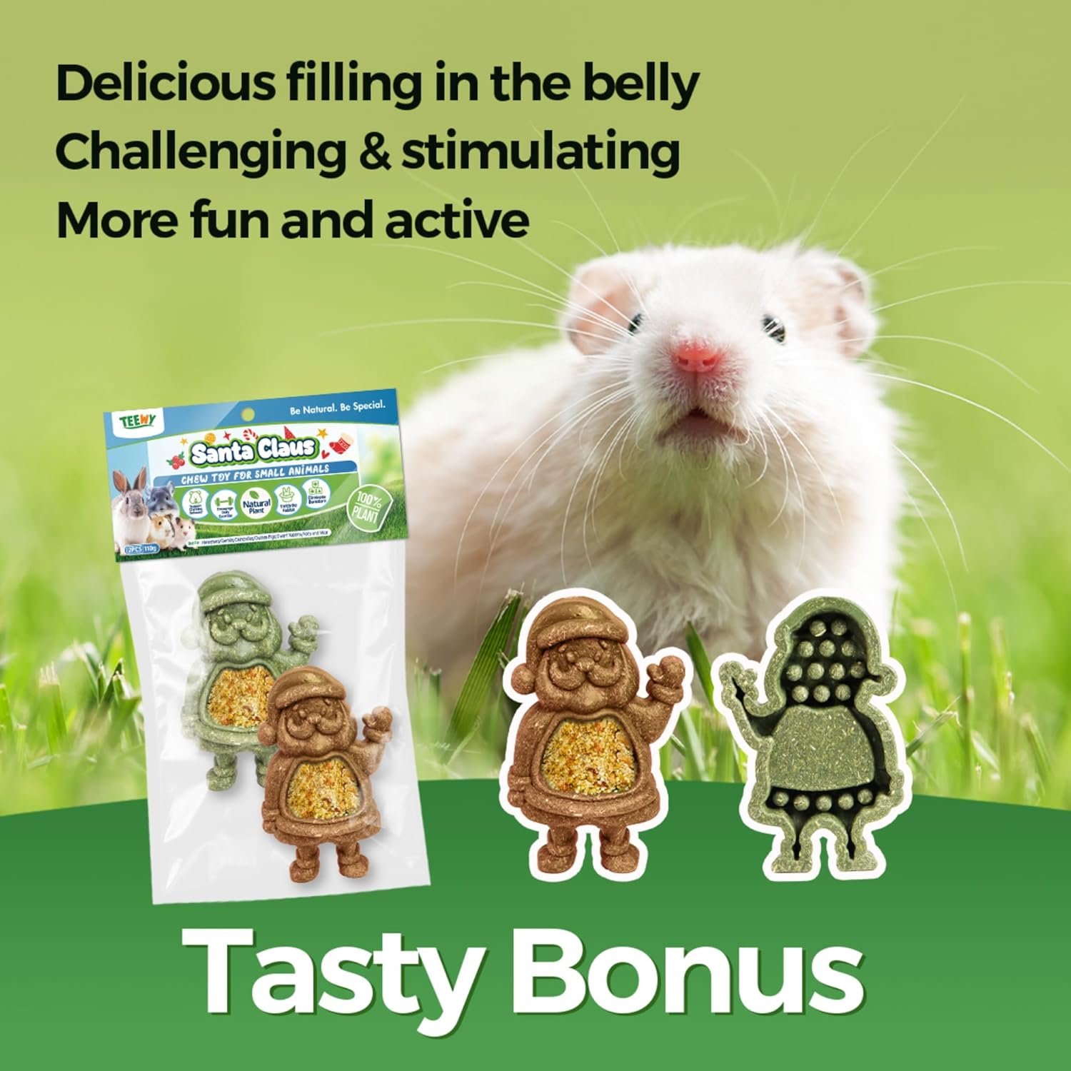 TEEWY small animal chew toys and nibblers are safe, natural, and edible. Made for chewing and provide many benefits, including mental stimulation, dental health, and boredom prevention.This Santa toy is ideal for awesome enrichment fun for your hamster, gerbil, chinchilla, guinea pig, and rat.