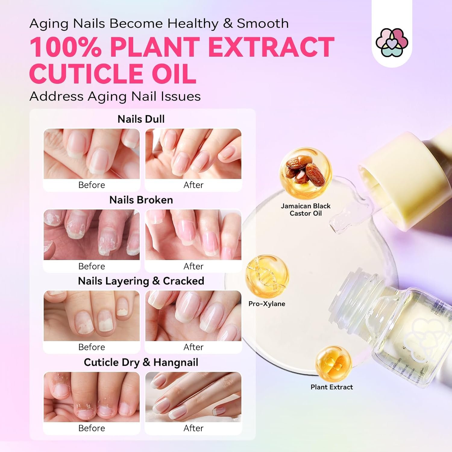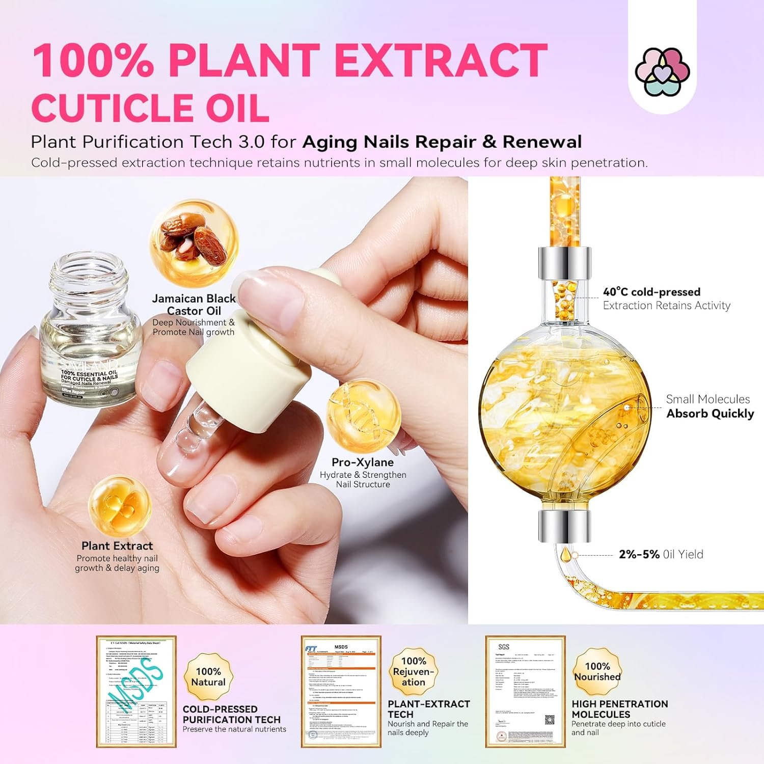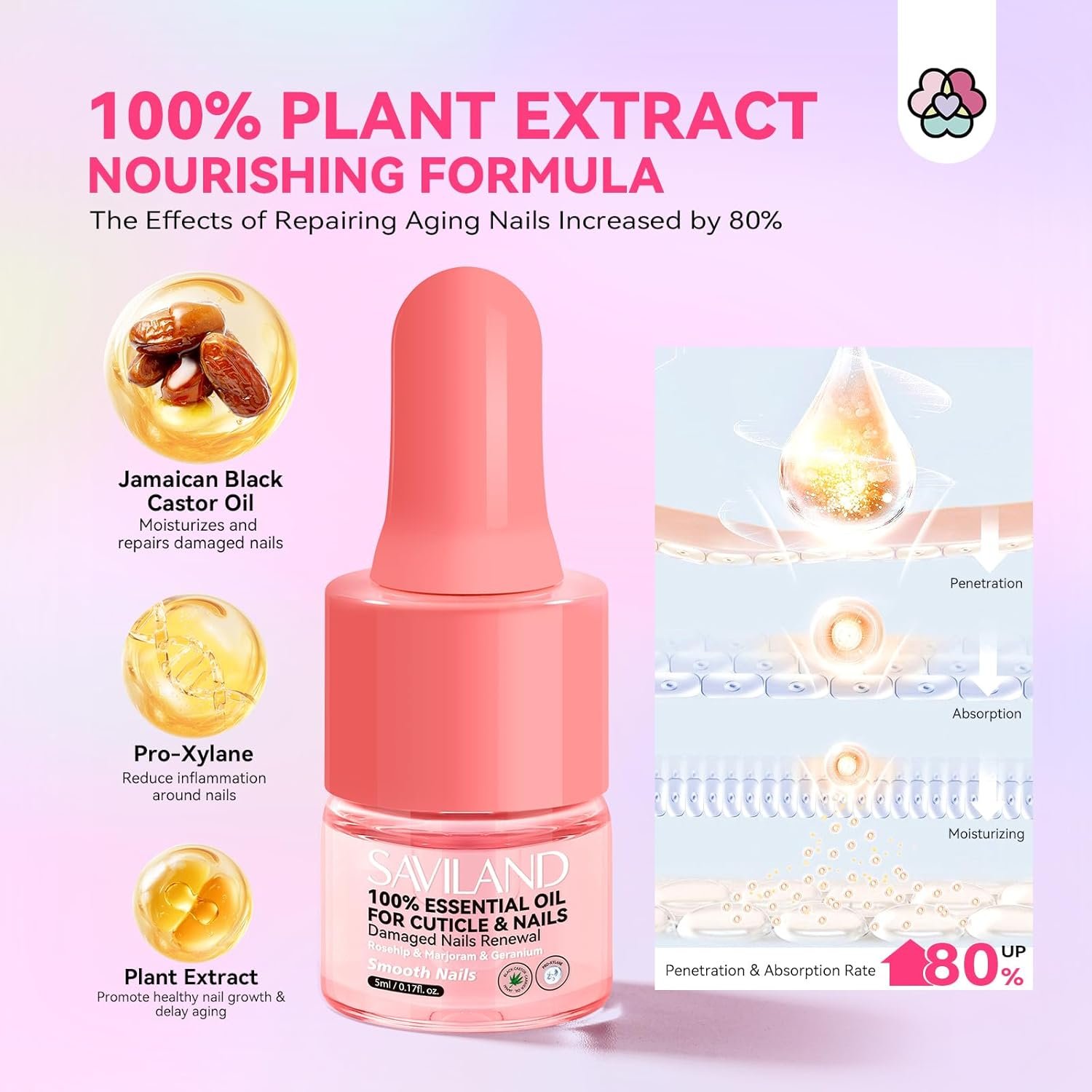Natural Plant-Based Ingredients: SAVILAND cuticle oil for nails is based on pure Jamaican black castor oil and enriched with natural plant extracts such as lavender, rose, grapeseed, lemon. They are hexane-free, cold-pressed unrefined, which can deeply moisturize, fortify nails, and effectively combat cuticle and nail aging. Applying the nail oil cuticle can increase circulation around your nails, stimulating healthy nail growth