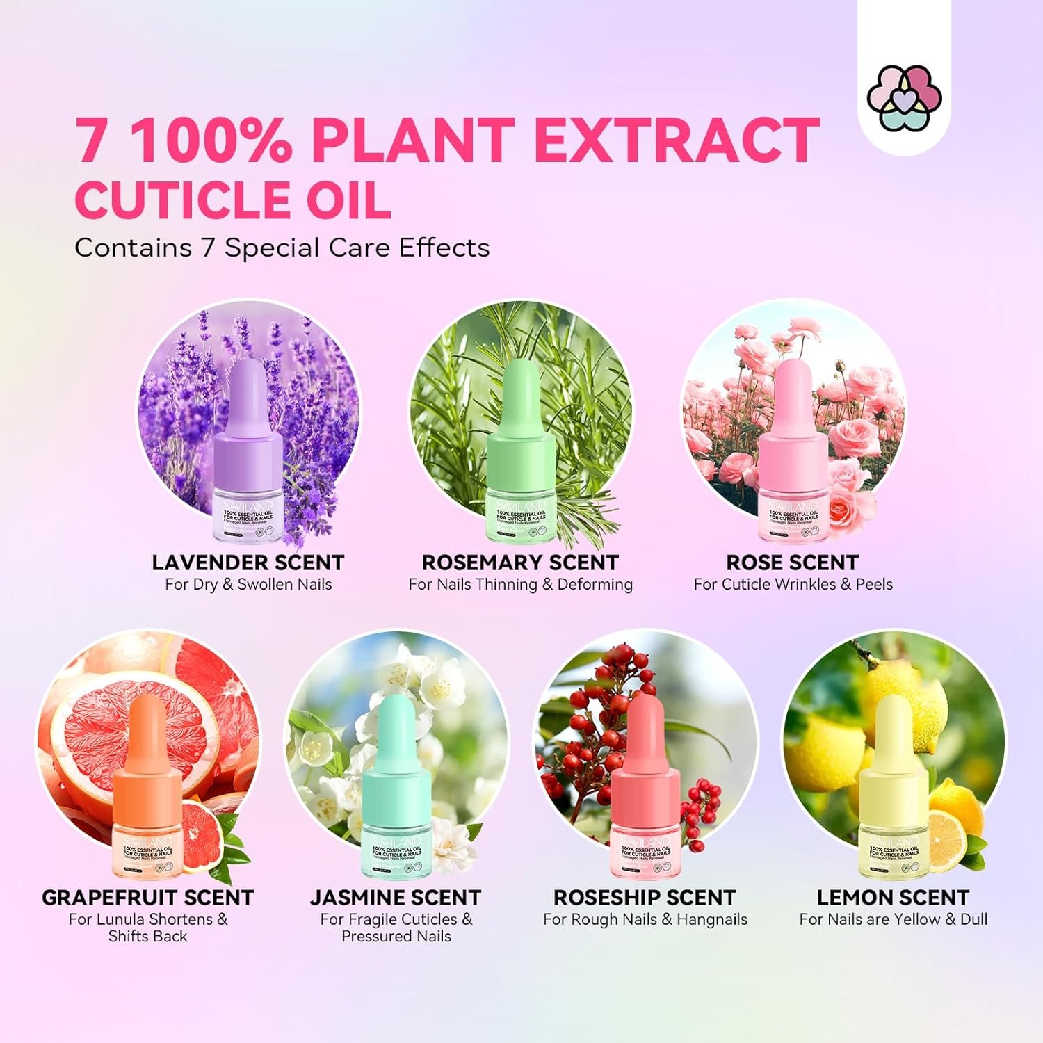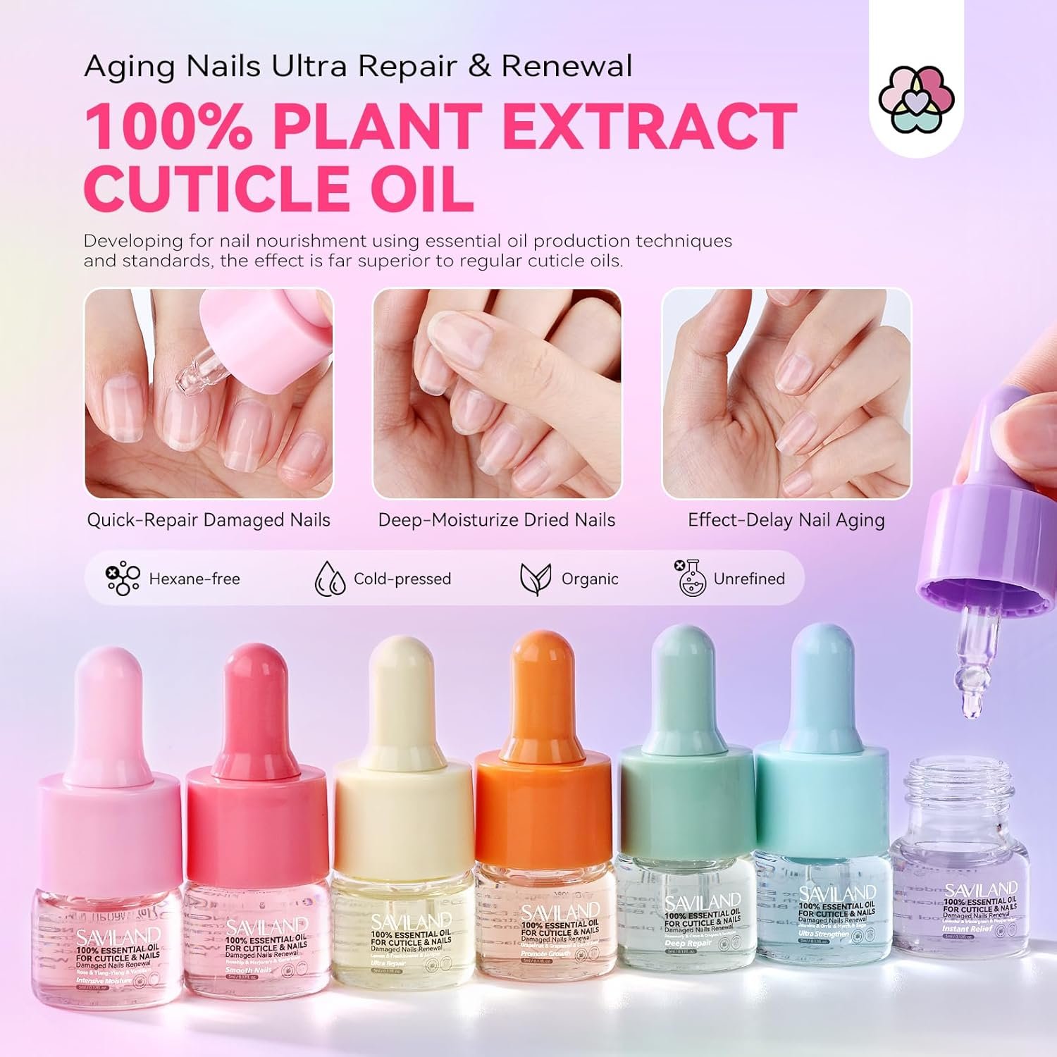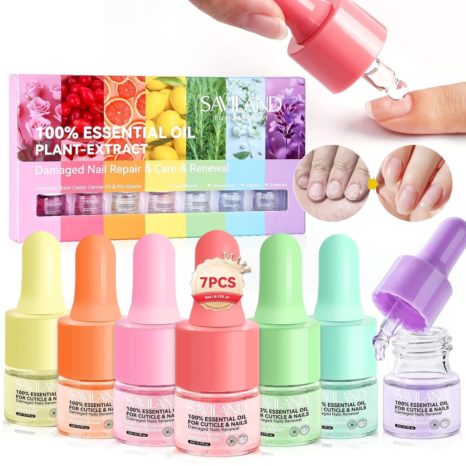 Complete Set for Reviving Aging Nails: SAVILAND 7-piece collection of natural essential cuticle oils promise a holistic rejuvenation of aging nails! Each nail care kit is specifically formulated to instantly soothe, deliver deep repair, intense hydration, stimulate growth, boost strength, and ensure cuticles and nails are smoothed and thoroughly restored. Infused with Vitamin C, this nail strengthener and growth oil deeply penetrates the skin to nourish, moisturize, and protect your cuticles and nails from damage