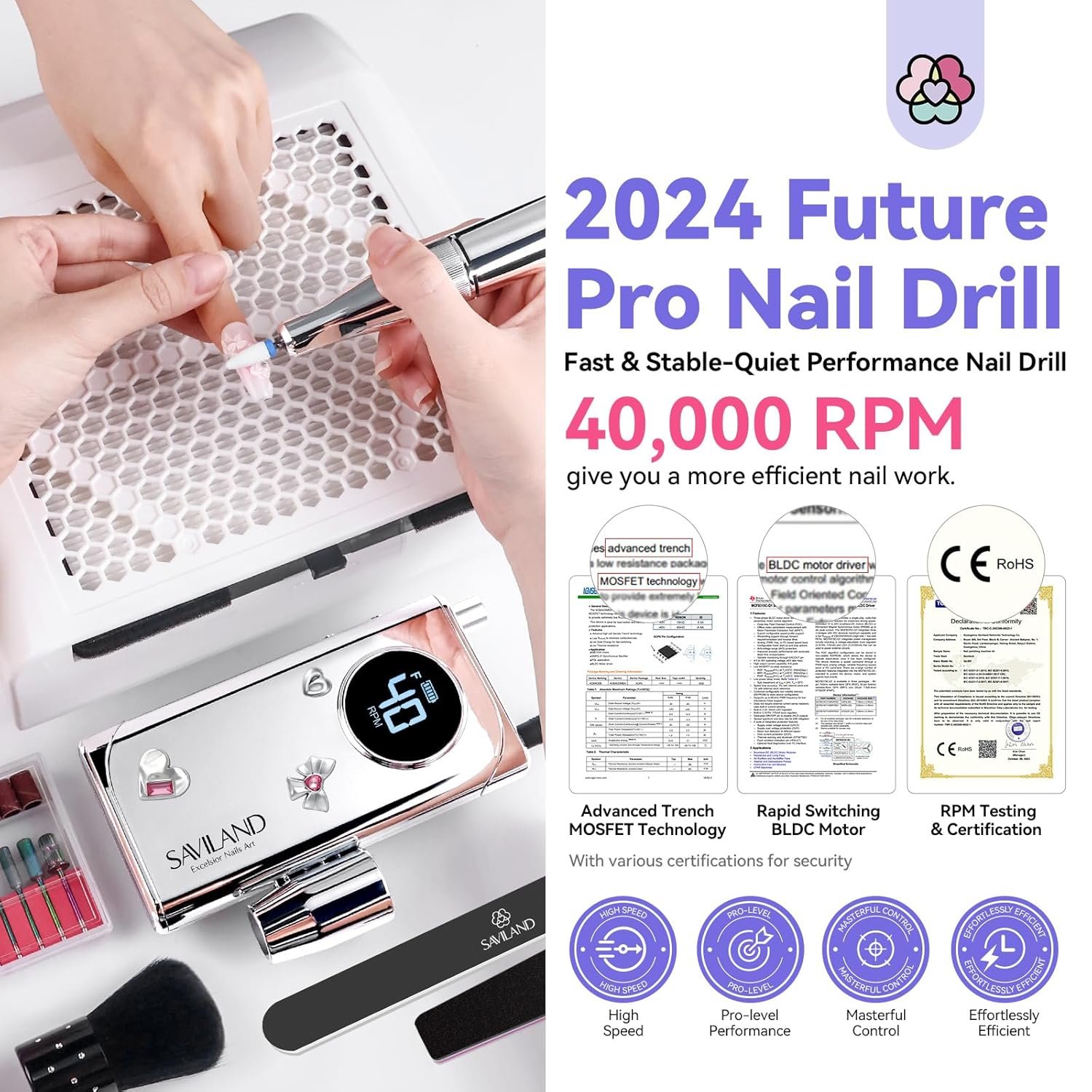 2024 40000 RPM High Tech Acrylic Nail Drill for Professionals: The 2024 40000 RPM high tech e-file is designed for professionals with patented matallic sustainable materials, it can remove the thickest acrylic nails in 3 mins with advanced MOSFET technology. Low vibration, low noise, no heat, full comfort.