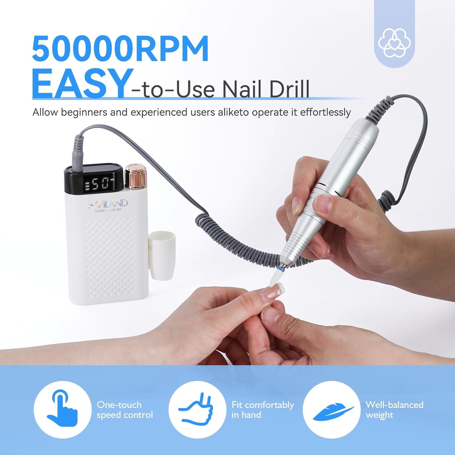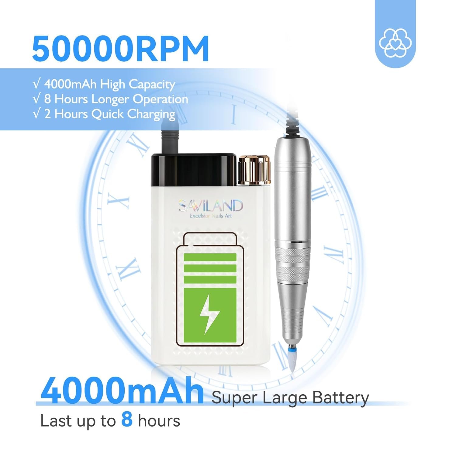 Professional 50000RPM Nail Drill Set: Saviland portable electric nail drill set comes with a nail drill machine and a nail drill pen, up to 40000RPM. A must-have nail drill for professional nail salons, providing better service to your clients. Also, perfect for nail art lovers or nail starters DIY nails at home