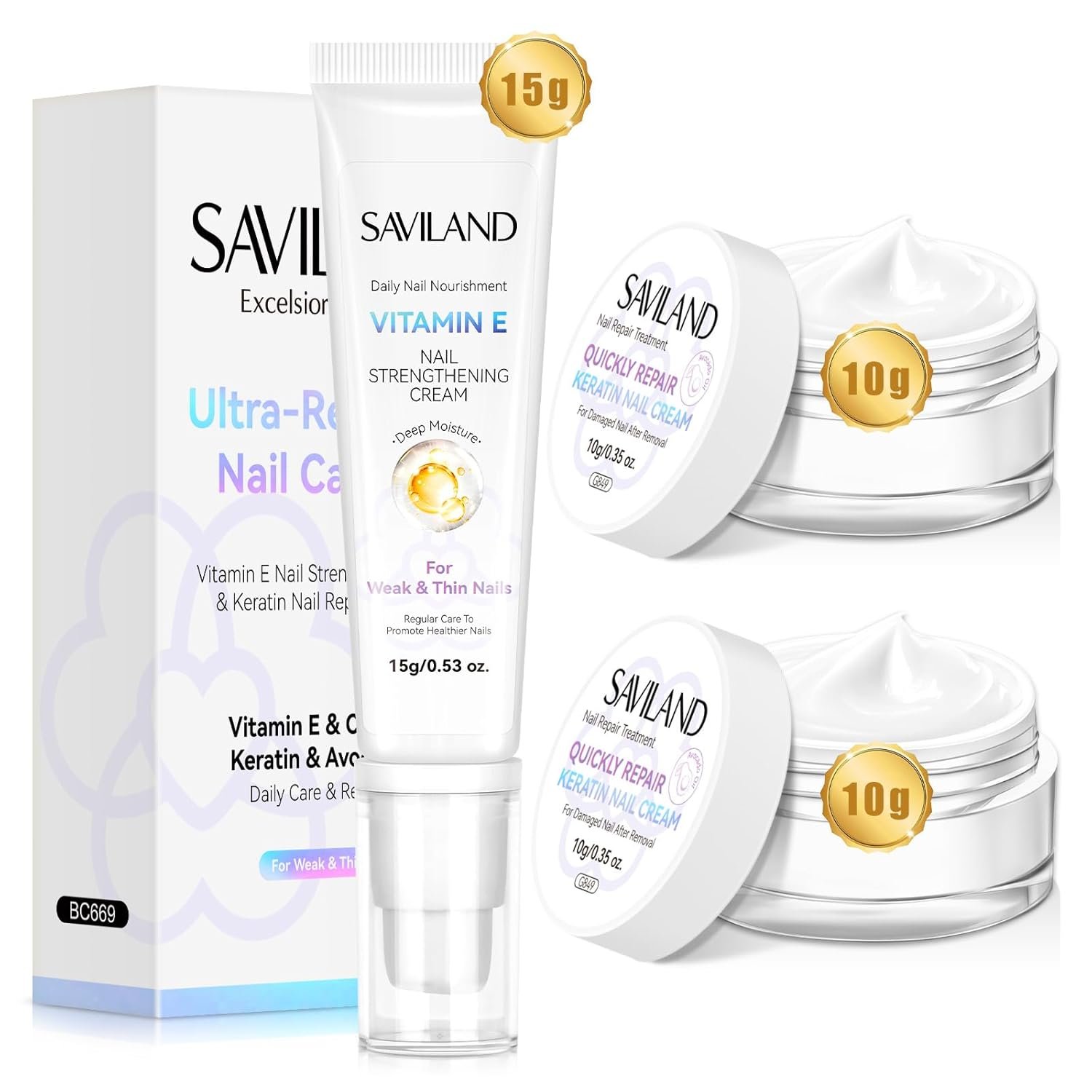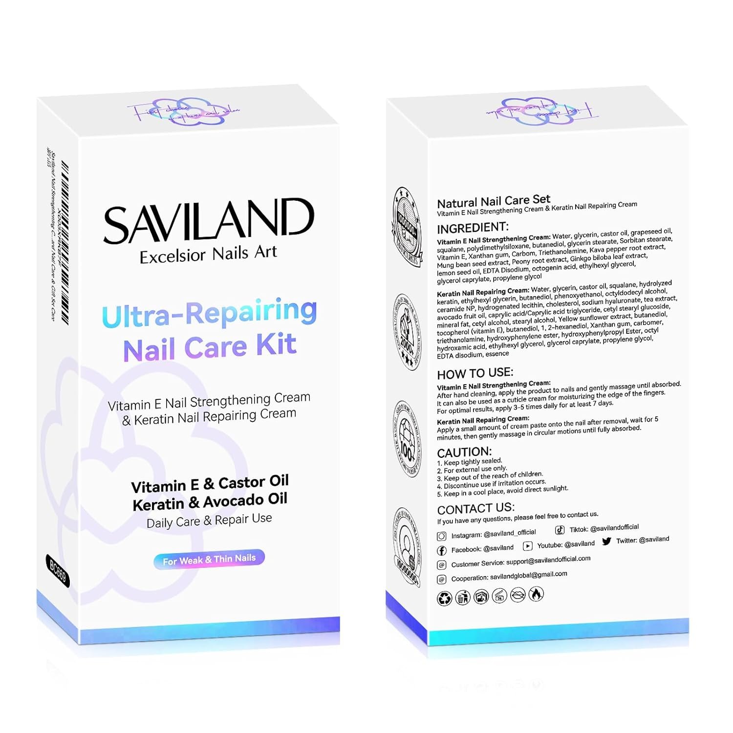 Ultra-repair Nail Splits, Chips, Cracks: SAVILAND nail repair cream is infused with natural ingredients (glycerol, grape seed oil, castor-oil, hydrolyzed keratin, vitamin E and ambrette extracts) that can strengthen and condition your nails and cuticles. They help fix damage caused by fake, acrylic or gel nails, moisturize cuticles, improve issues like hangnails, dryness, nail layering, vulnerability to breakage or vertical/horizontal cracks and smooth rough nail surfaces with a glossy finish