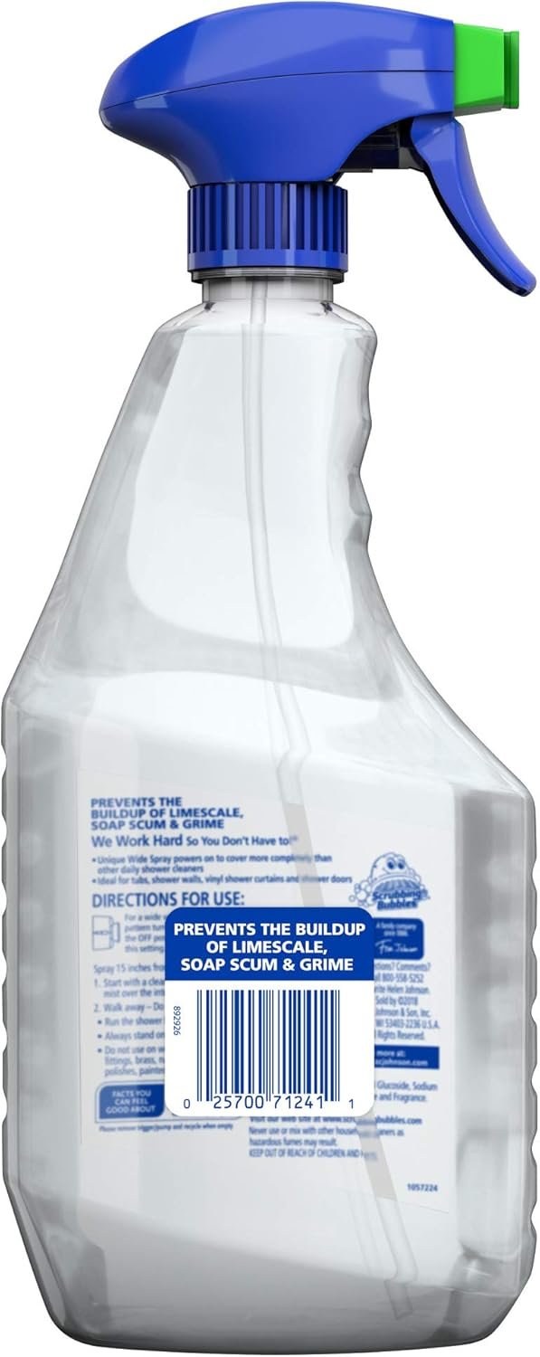 Scrubbing Bubbles Daily Shower Cleaner is a shower spray perfect for keeping your shower fresh between cleanings. With regular use, Daily Shower Cleaner helps prevent the build-up of soap scum, limescale, and grime on tubs, shower walls, vinyl shower curtains and shower doors. Its adjustable wide spray powers on to cover more completely than other daily shower cleaners with no rinsing, wiping, or scrubbing needed. It keeps messes away and leaves behind the fresh scent of Rainshower. When bathroom surfaces need a deeper clean, use Scrubbing Bubbles Mega Shower Foamer. It’s a delightful combination of amazing clean and fresh Rainshower scent that works great together with Daily Shower Cleaner – a fresh dream team.