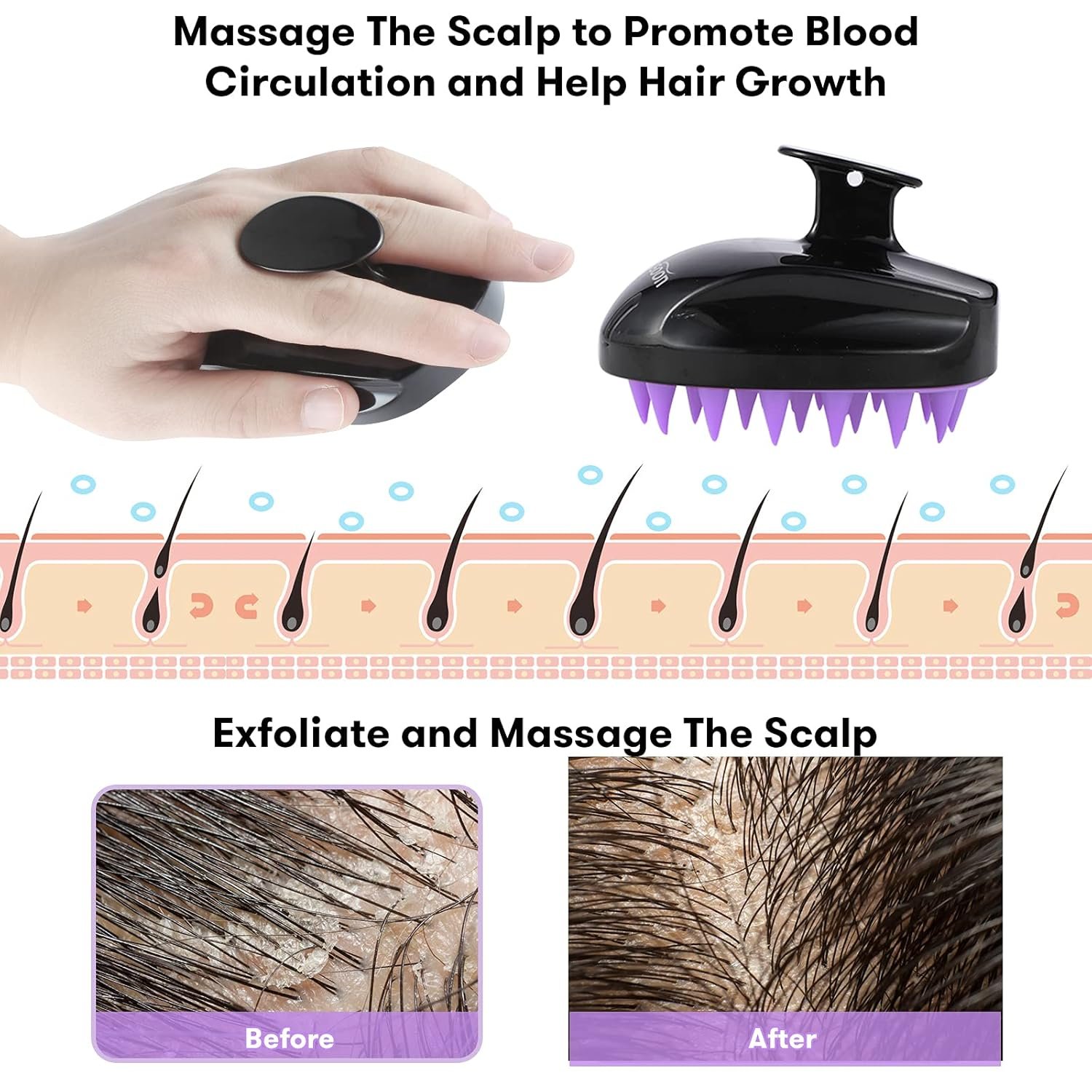 The scalp massager hairbrush has an ergonomically designed non-slip handle, perfectly fits in your hand and is easy to hold when using shampoo and conditioner to brush your hair. Uneven soft silicone bristles perfectly fit your scalp, there is no greater feeling in the world than a scalp massage!