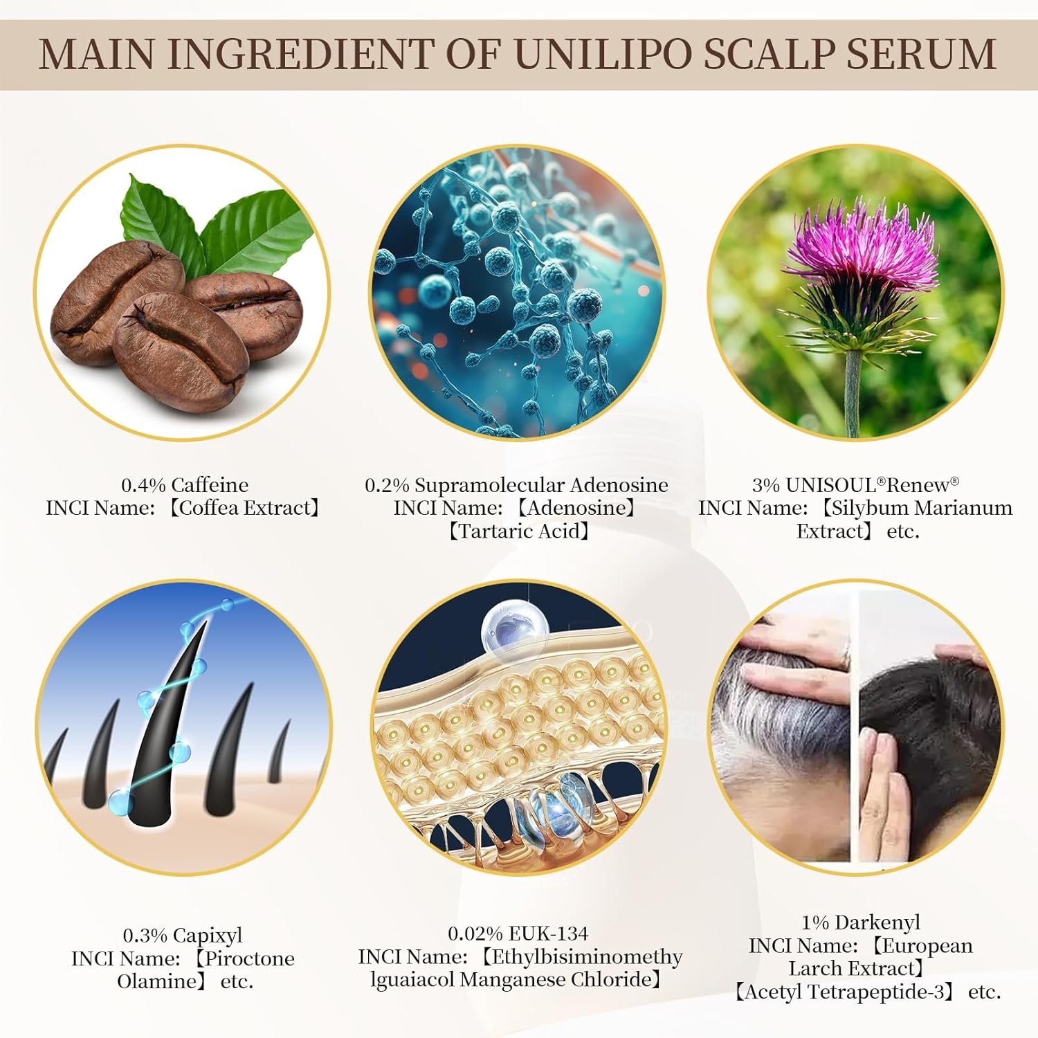 Main ingredients: 0.4% caffeine, 0.2% supramolecular adenosine, 3% UNISOUL Renew