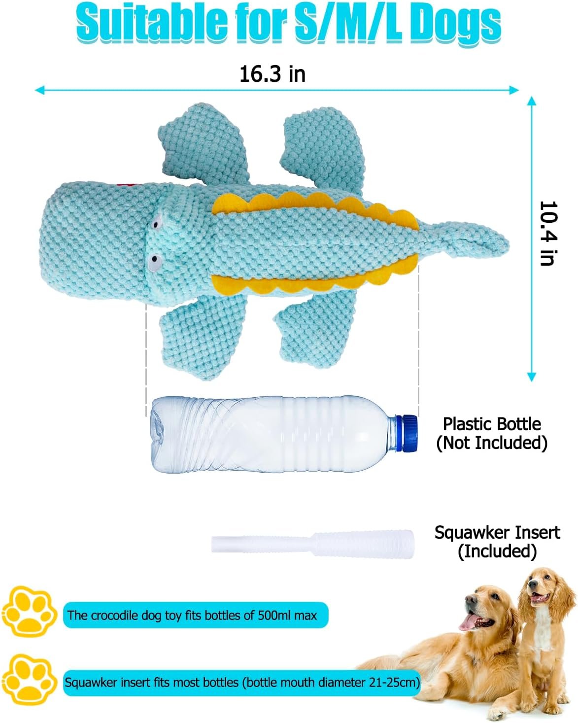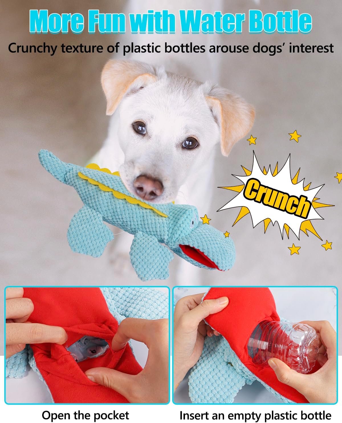 Squeaky & Crinkle Sound: In addition to the cruncher of the water bottle, the crocodile doggy toy contains 2 squeakers in two of the legs and crinkle paper in the jaws and the other two legs, which makes multiple sounds to keep puppies stimulated and endlessly entertained.