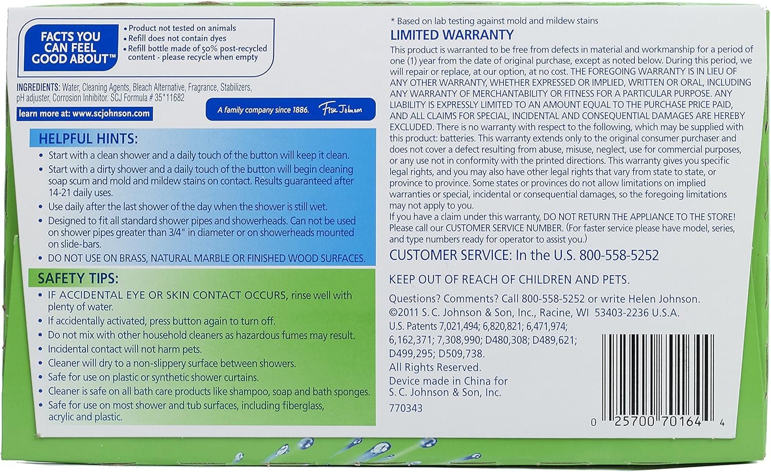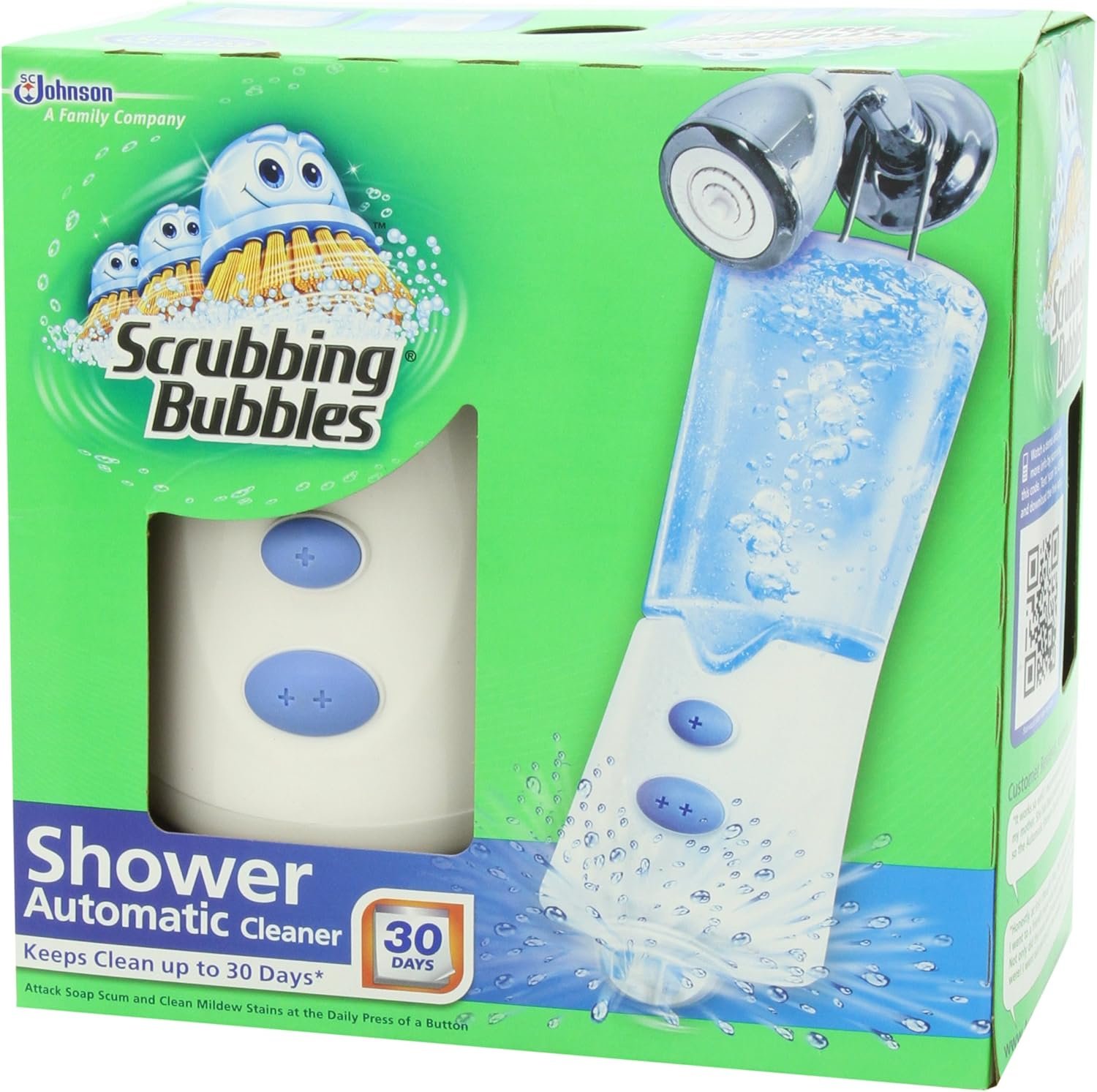 With the Scrubbing Bubbles Automatic Shower Cleaner, you’ve got a cleaning partner that takes care of the tough stuff for you. Simply touch the button and walk away—the dual sprayer spins 360 degrees to spray a penetrating cleaner on all four walls and tub. The formula prevents tough stains like helps remove soap scum, allowing you to wait to clean your shower for up to 30 days! A booster button provides even more shower cleaning power when you need it. And now your Scrubbing Bubbles Automatic Shower Cleaner starter kit comes with a Fresh Clean formula that keeps your bathroom smelling great for up to 24 hours.