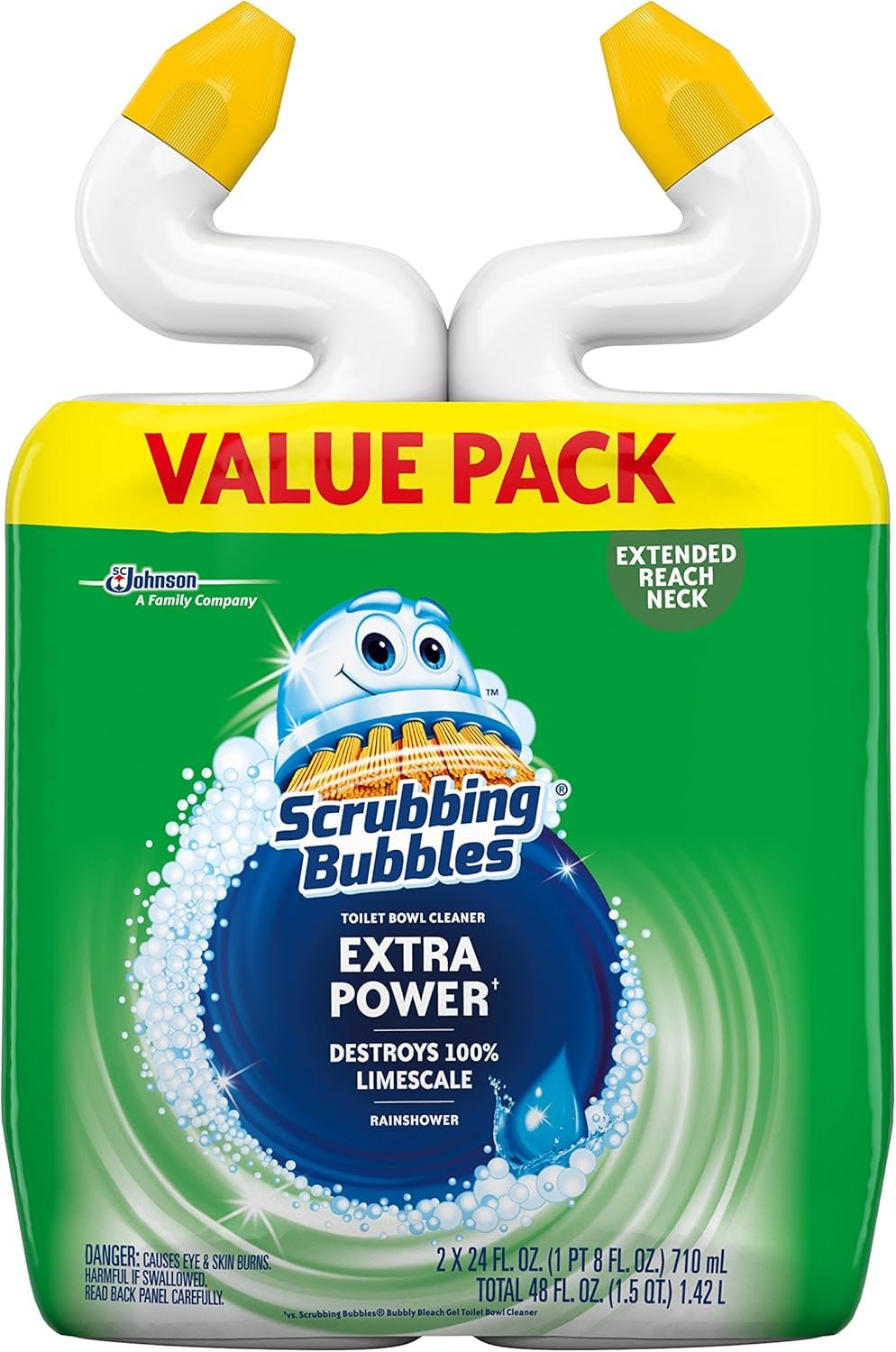 Scrubbing Bubbles Extra Power Toilet Bowl Cleaner removes tough stains including rust and destroys 100% of limescale. Scrubbing Bubbles’ most powerful toilet stain-fighting formula against limescale changes from green to blue as it powers through toilet bowl stains. Apply under the toilet rim and leave for 15 minutes. Scrub the bowl and flush to rinse. Done. It’s goodbye rust and limescale, hello fresh scent (available in Rainshower and Citrus scents). After cleaning, use Scrubbing Bubbles Fresh Gel Toilet Cleaning Stamp to keep your toilet smelling fresh.